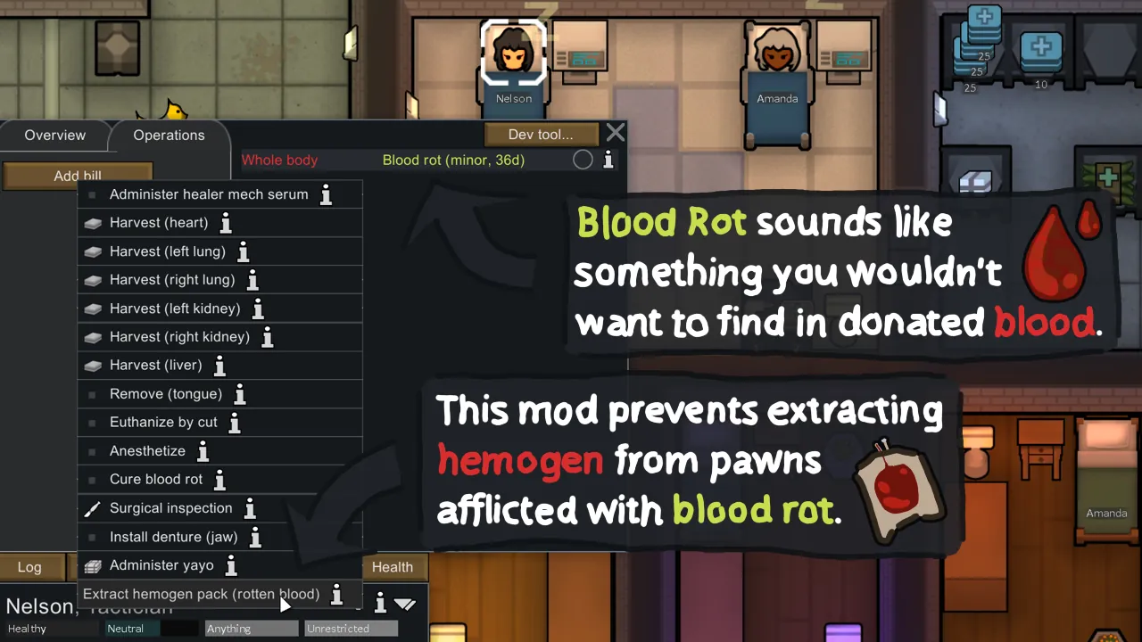 Source code for the mod can be found [url=https://steamcommunity.com/linkfilter/?u=https%3A%2F%2Fgithub.com%2FClementsaic%2FNoRottenHemogen]here[/url][github.com], along with release versions for non-steam users.