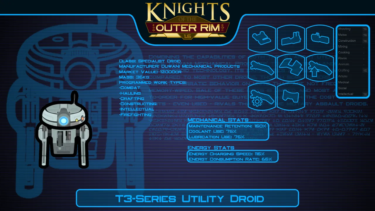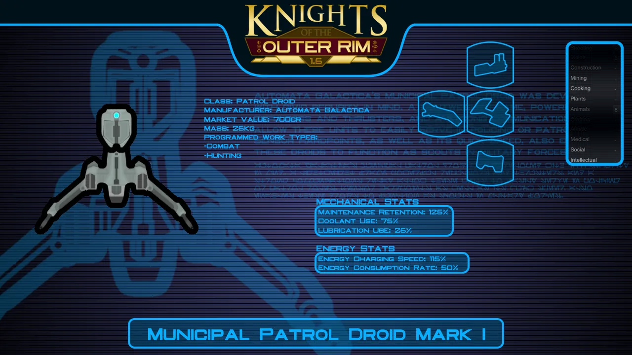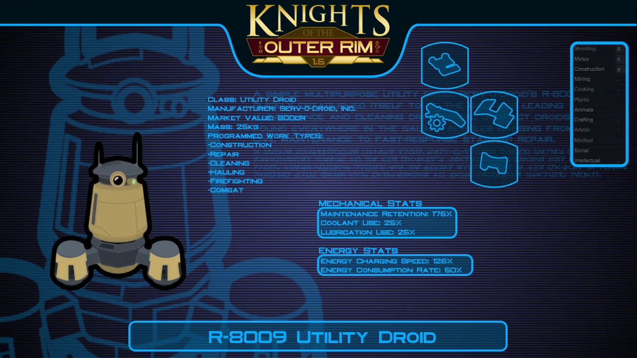 - RESEARCH: For this mod I've added a series of research projects to unlock crafting recipes for most of the droid types this mod offers. The highest tier of droids require techprints in order to research them.