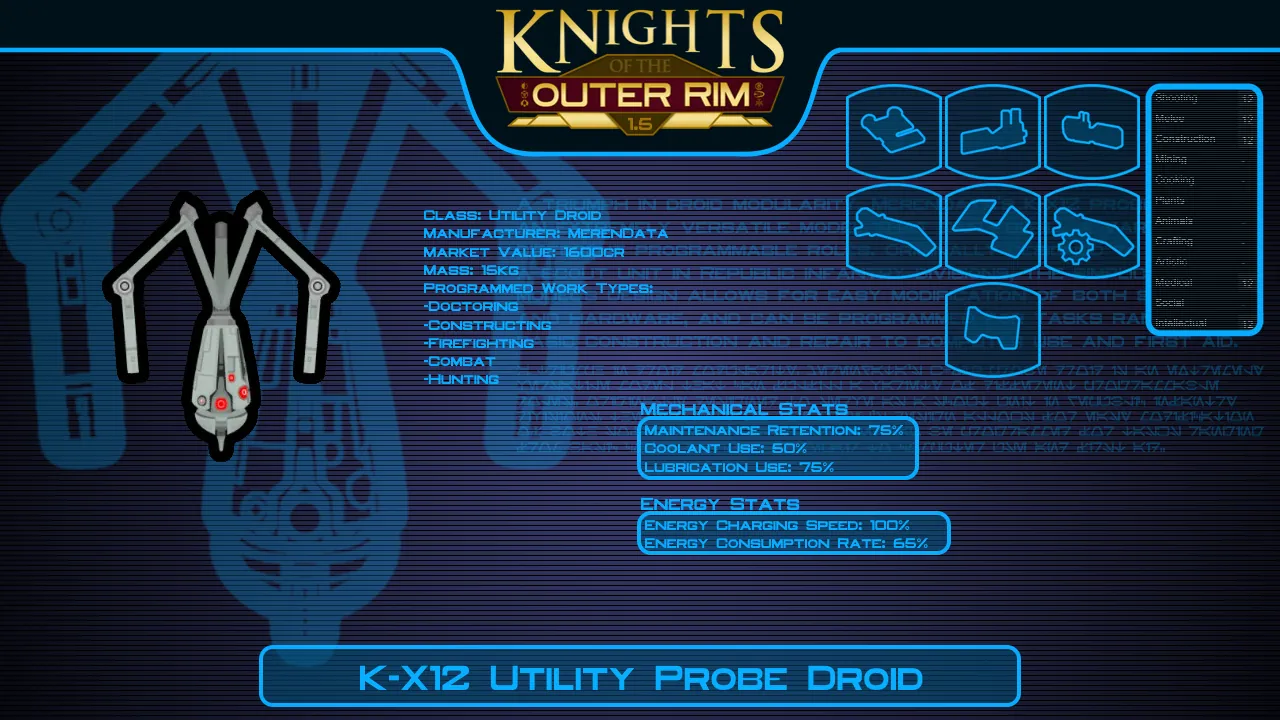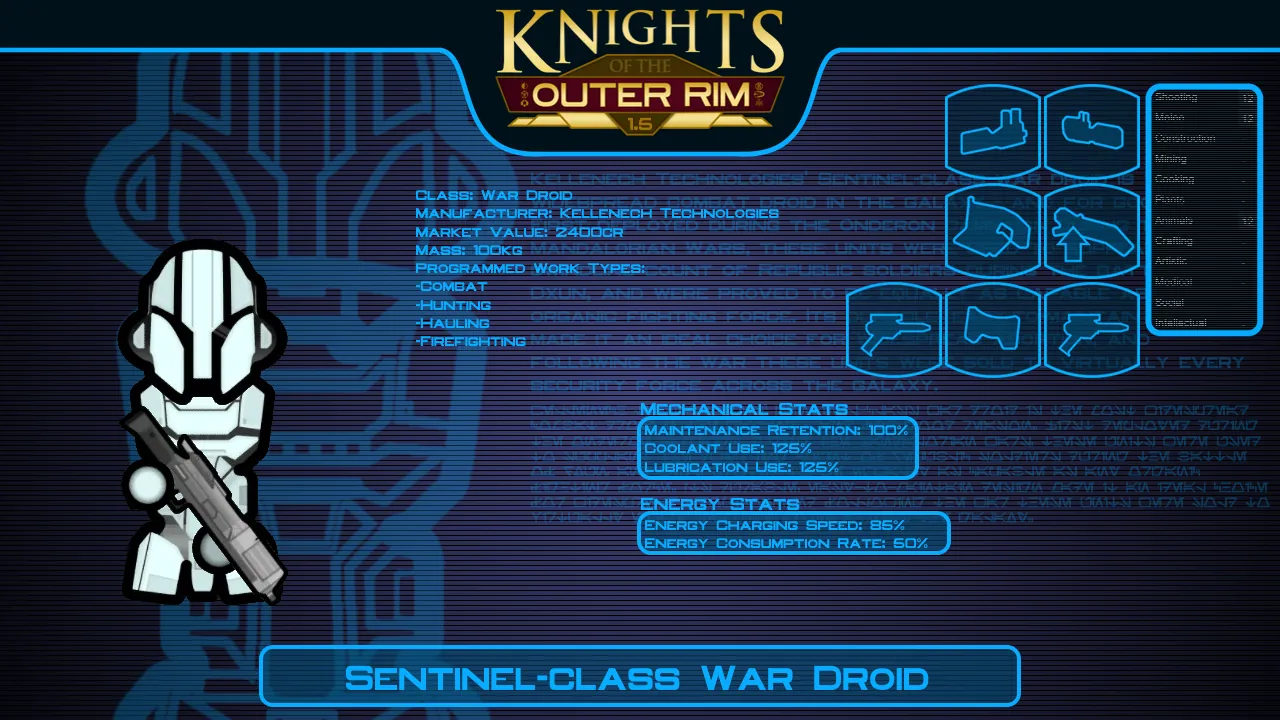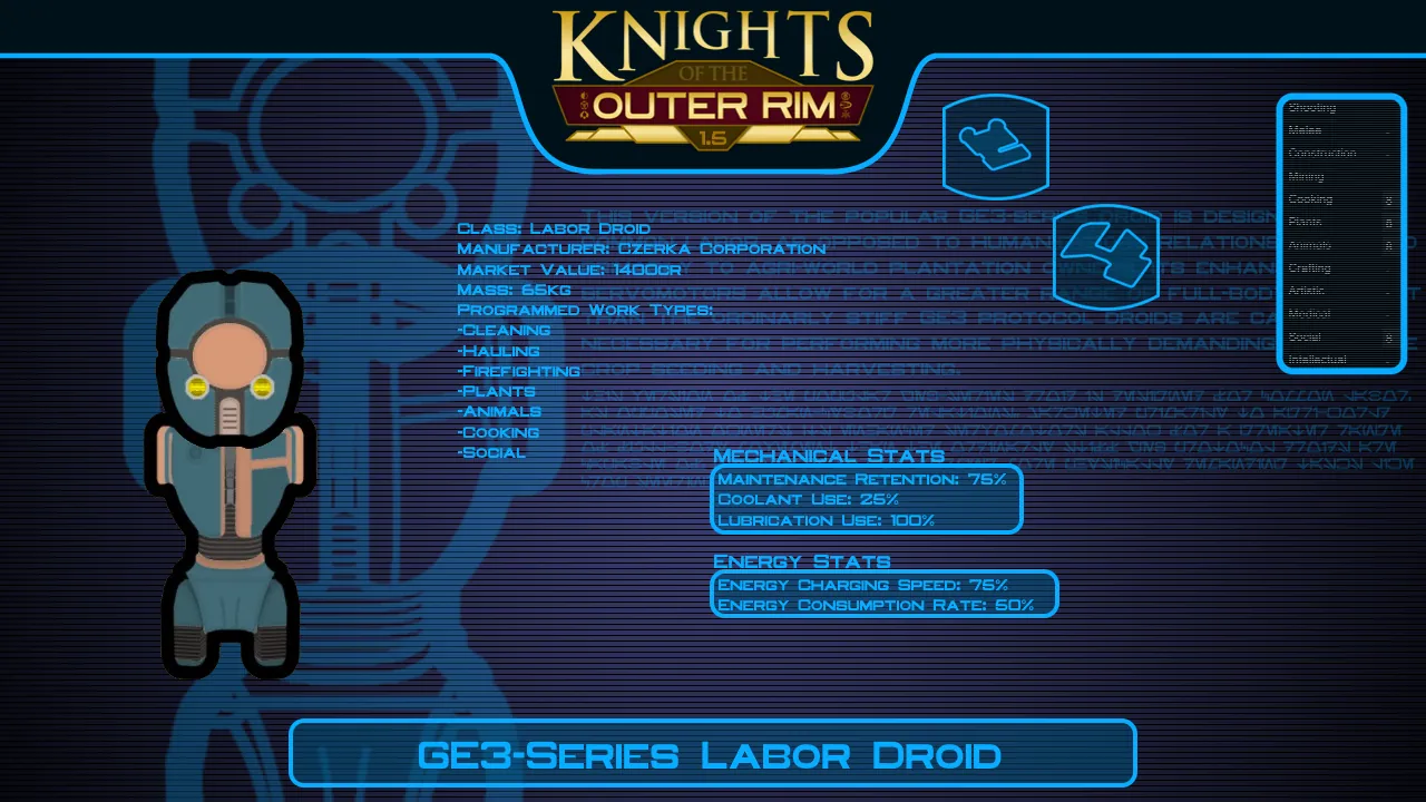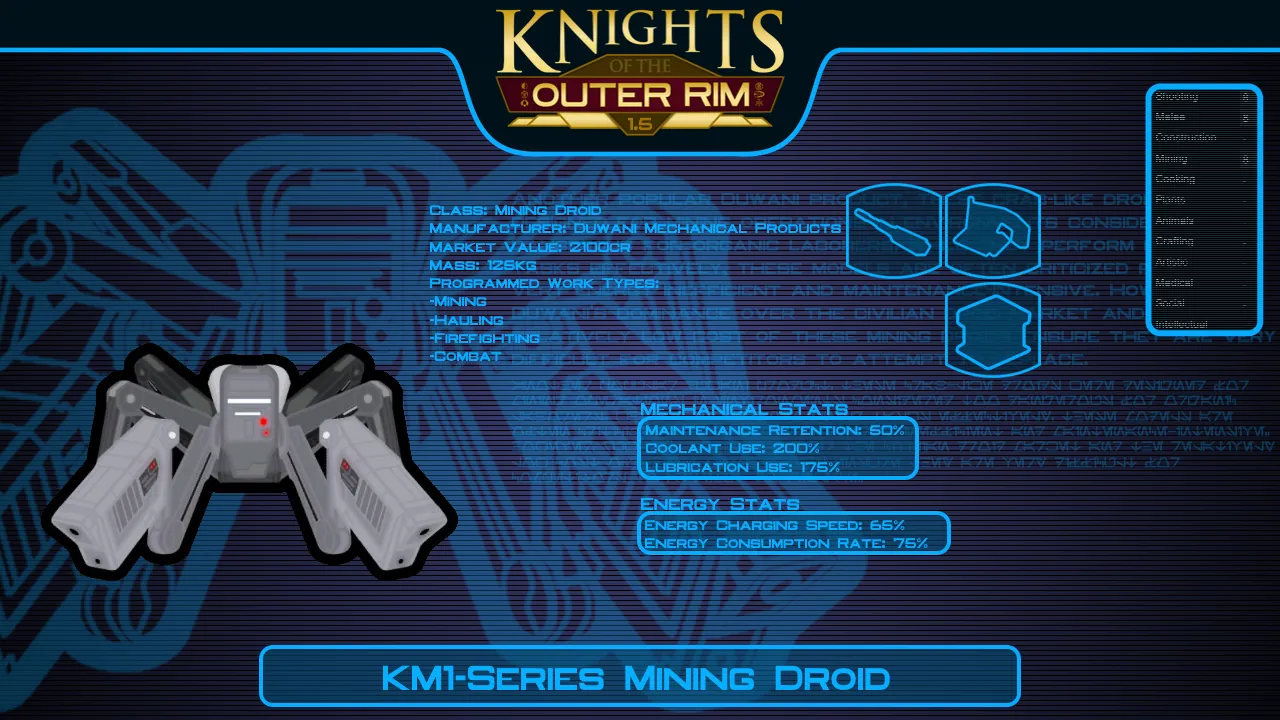 - RESEARCH: For this mod I've added a series of research projects to unlock crafting recipes for most of the droid types this mod offers. The highest tier of droids require techprints in order to research them.