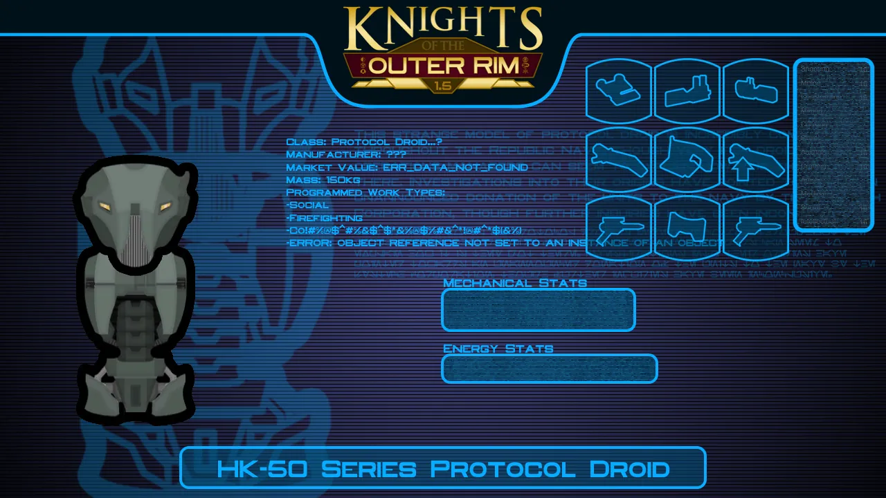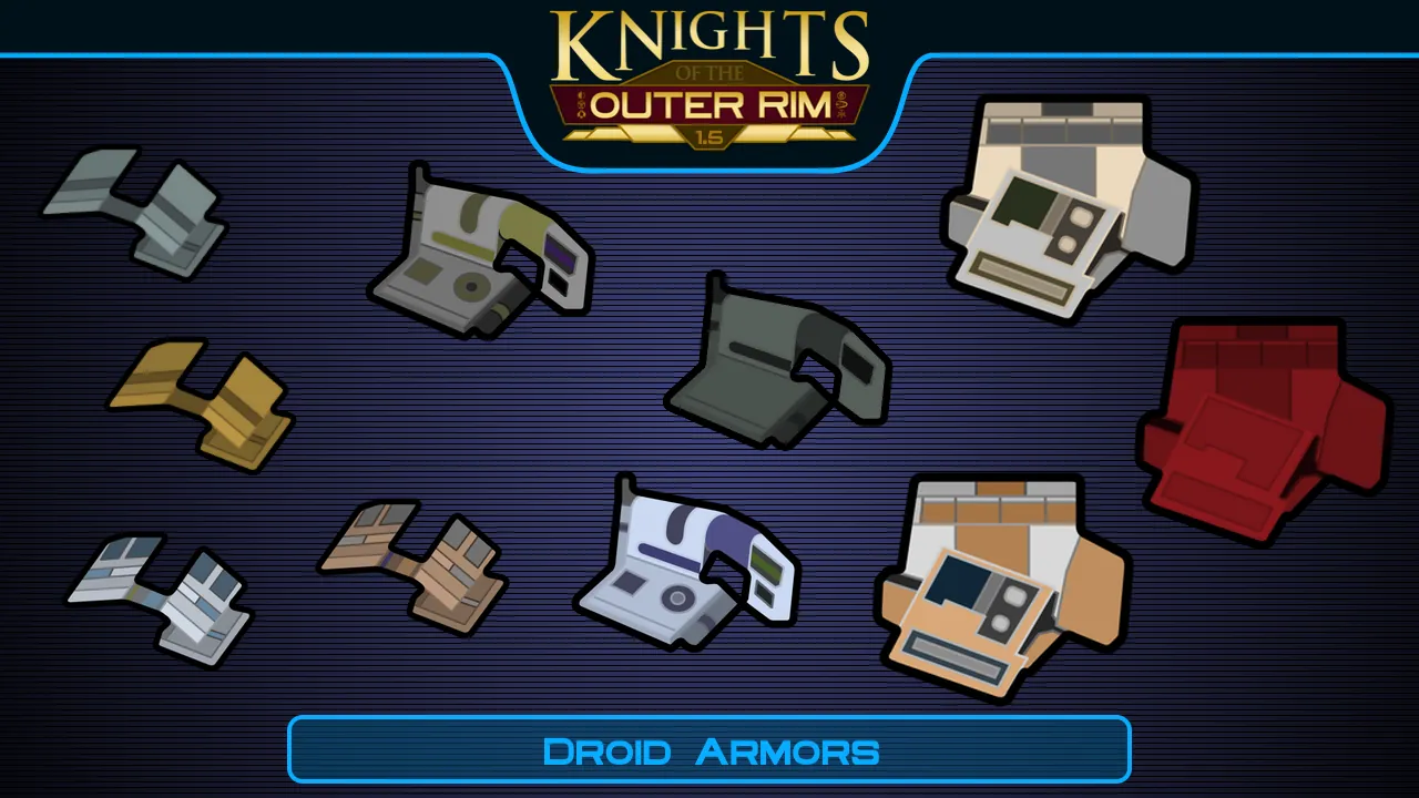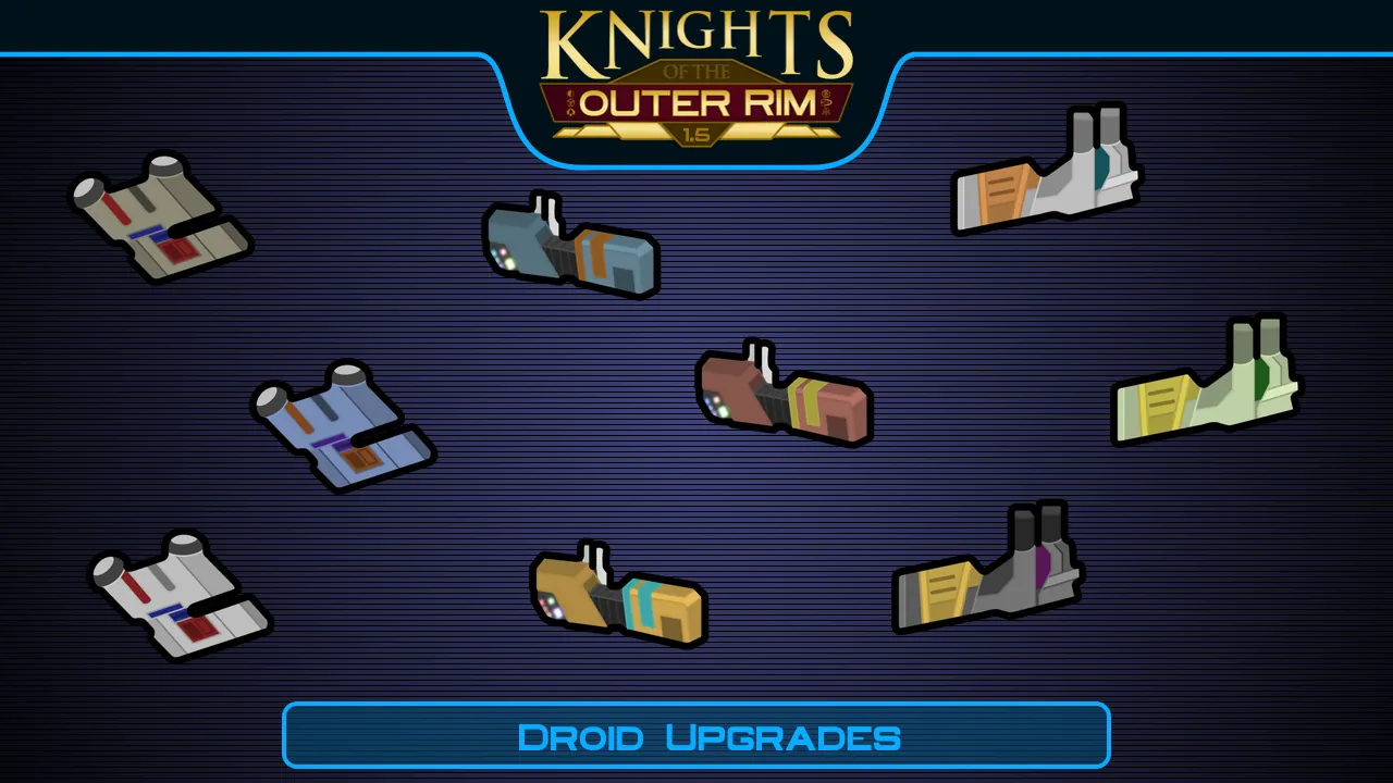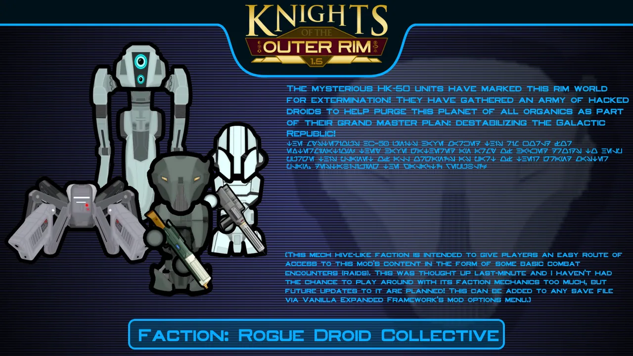Adds 22 types of droids from Star Wars: Knights of the Old Republic and Star Wars: Knights of the Old Republic II - The Sith Lords, as well as a mech hive-like faction, a new starting scenario, and a wide variety of droid-specific equipment. These droids use the Mechanical Humanlikes framework.