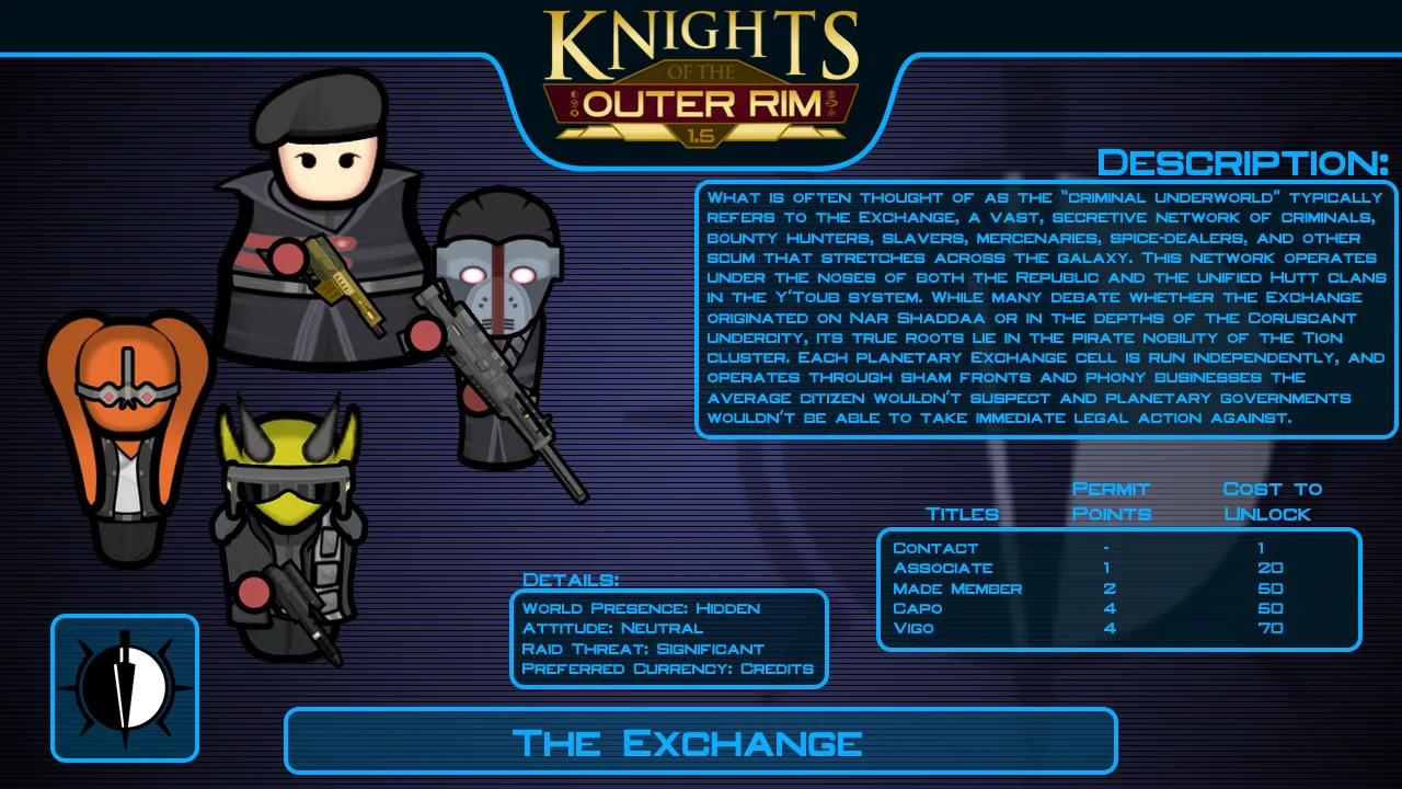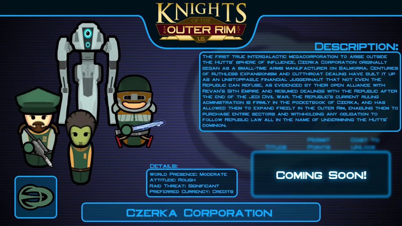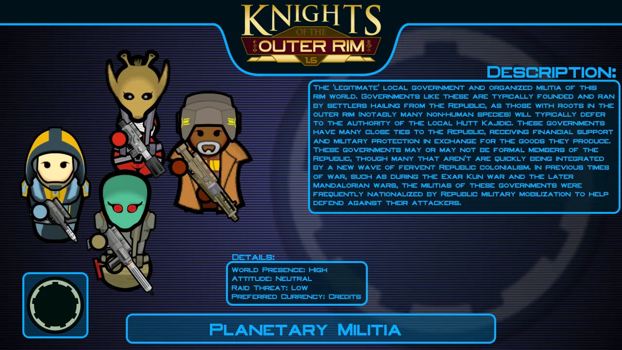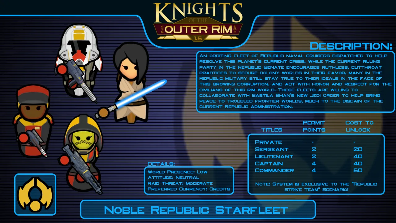 The general lore synopsis behind all of the descriptions is that this is set 5 years after KotOR 2, and the Republic has elected a corrupt imperialist regime out of fear of more Sith attacks like the ones on Onderon and Telos IV, cut off ties with the Hutts, and is taking over as many outer rim colony worlds as they can to support their post-war rebuilding efforts. I was going to write a nice, succinct Star Wars opening scrawl that explains all of this, but I am very tired at the moment.