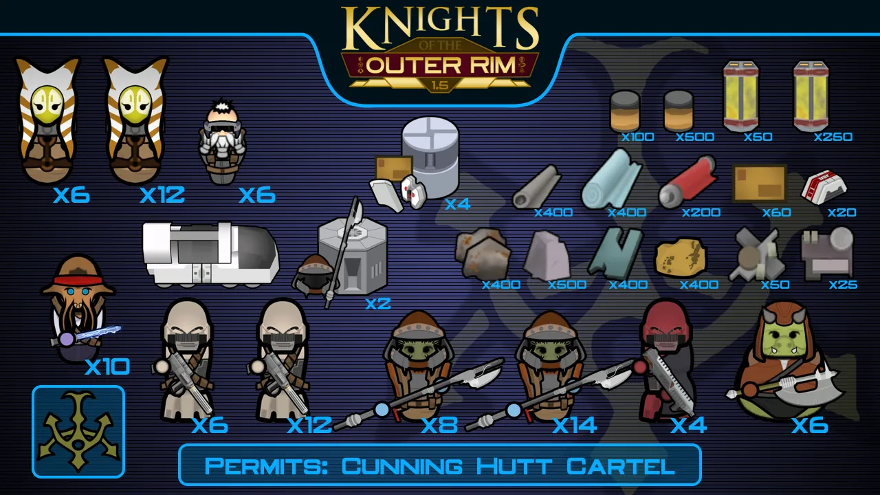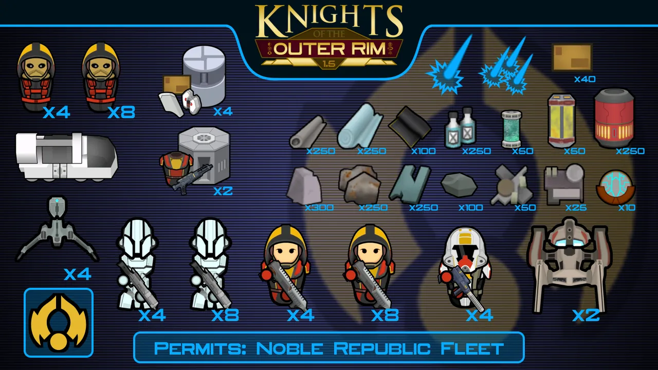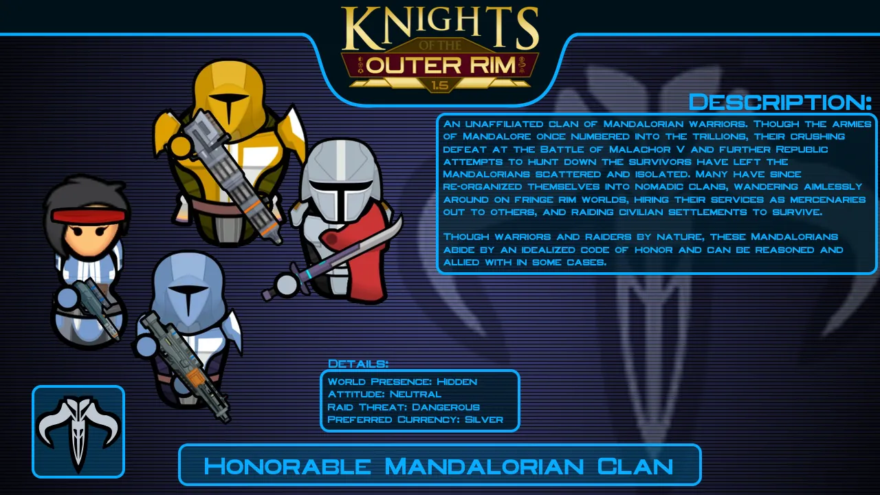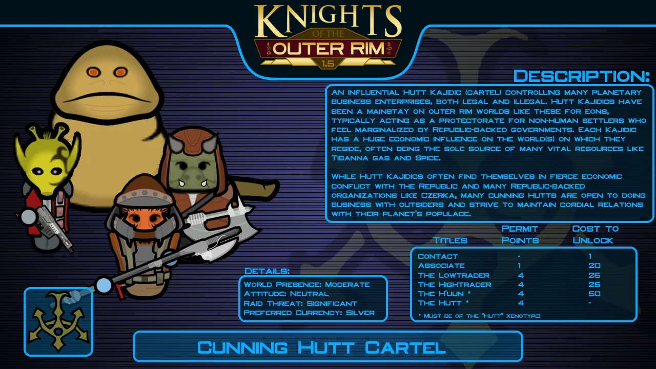 Adds 15 factions, along with pawns, titles, ideoligions, and starting scenarios based on factions in Star Wars: Knights of the Old Republic and Star Wars: Knights of the Old Republic II - The Sith Lords, and elsewhere in the Star Wars setting.