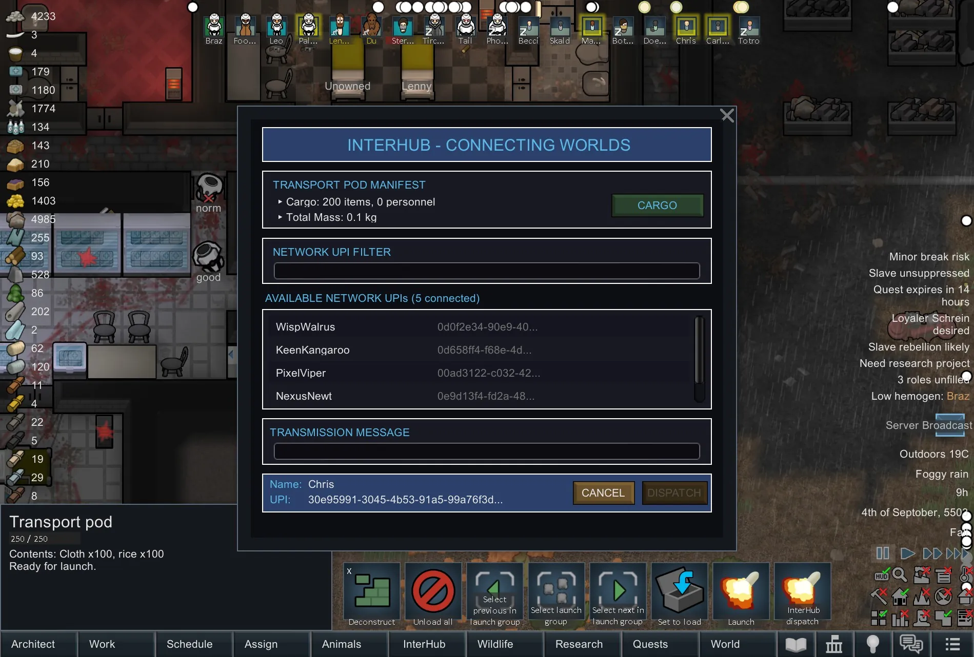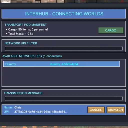 Each sender and receiver must have a UPI (Universal Post Ident). The mod automatically generates this on startup. This means you cannot send pods to different savegames on the same PC, unless you're running the game on different computers. One PC/installation equals one UPI.