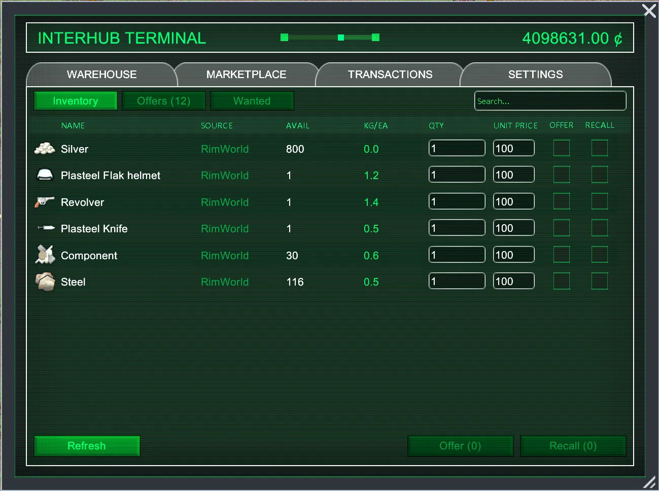 There is a big problem for this project, everybody can generate things in his savegame and upload them to the InterHub warehouse. This can break the economy. At the moment there are no good measures to prevent this, so please be fair. To counteract this to some extent, you can create private marketplaces where you can trade with your community.