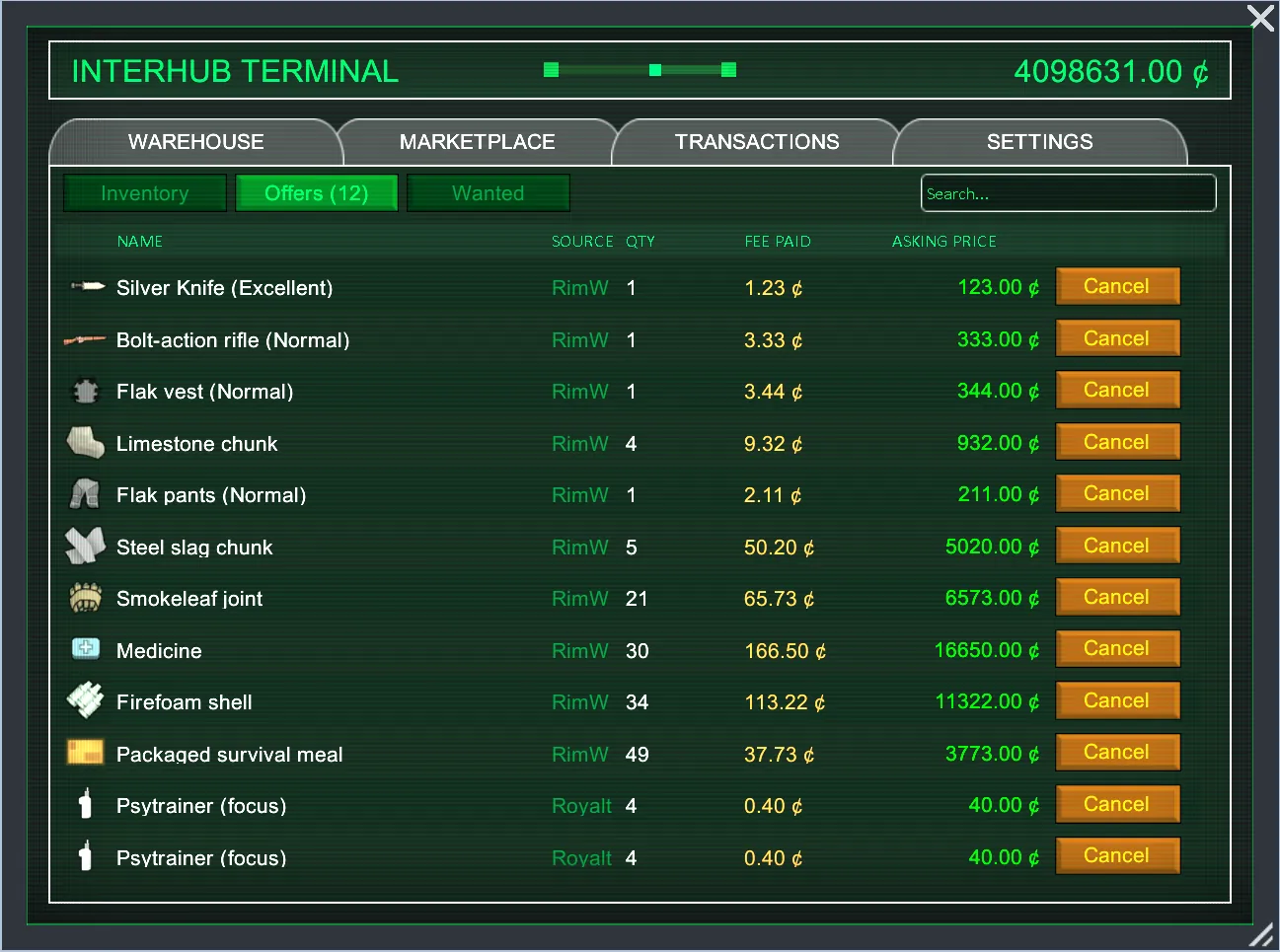 InterHub is a fictional interplanetary transport company. Using InterHub pods, you can ship items and pawns from your colony to a cloud-based warehouse. From there, you can sell them on the marketplace to other players - or buy what they offer.