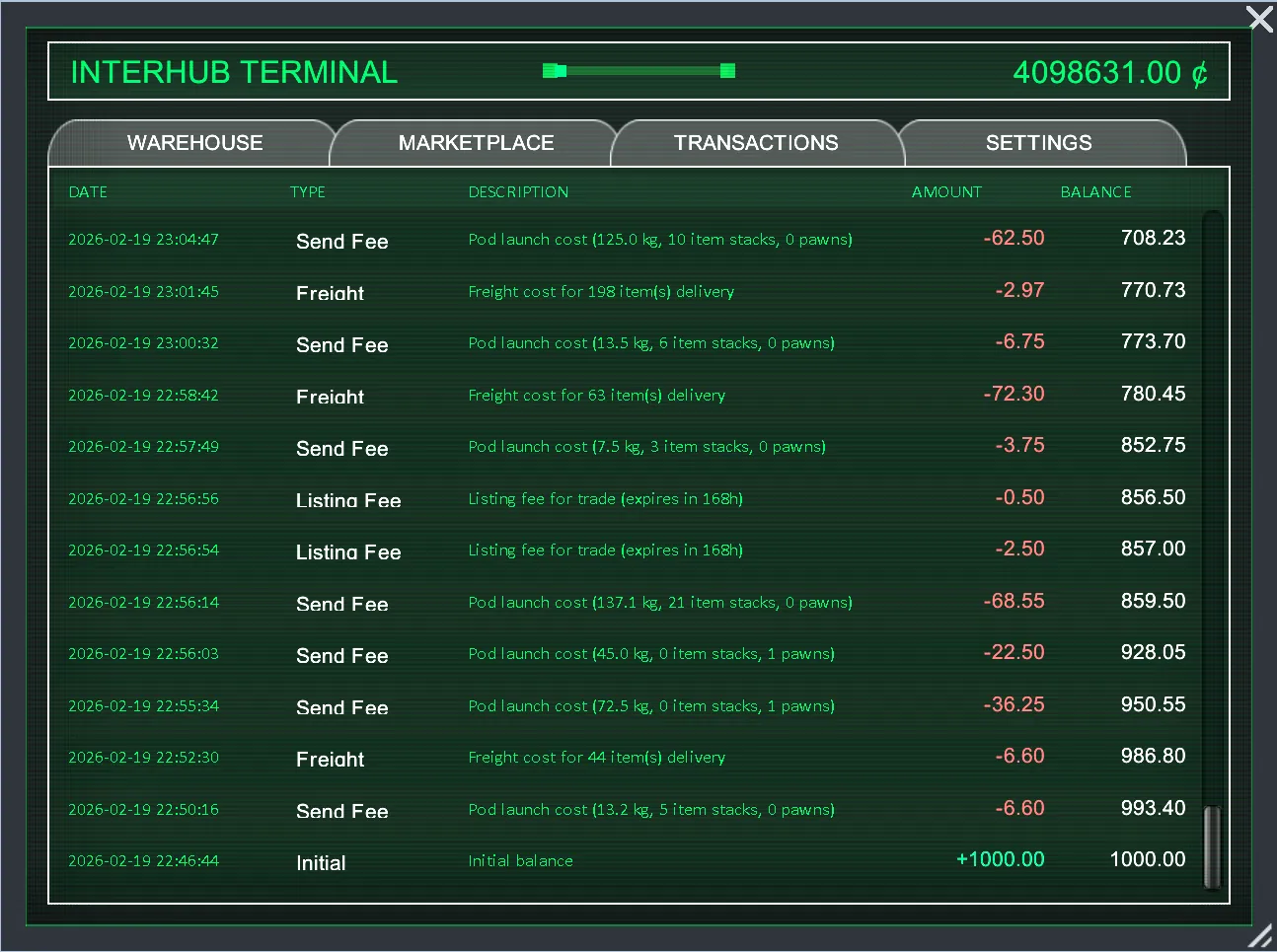 Every player has a credits balance. Shipping costs freight fees, listing items costs a marketplace fee, and buying items transfers credits between players. A real player-driven economy.