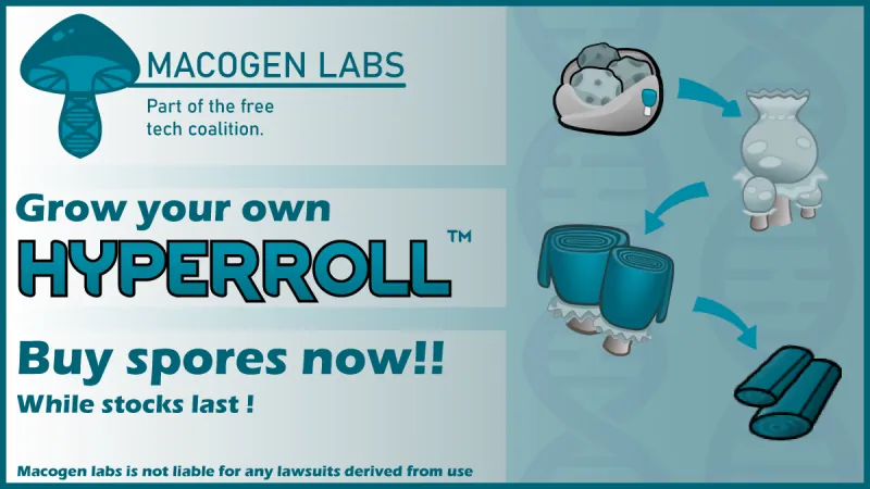Made by glittertech company Macogen Labs a few hundred years ago, the Hyperroll is an alternate way of producing hyperweave. Unfortunately, as things go in glittertech corps - in the midst of a legal and military corp war, Macogen Labs collapsed, with the spores since finding their way to the distant rimworlds.
