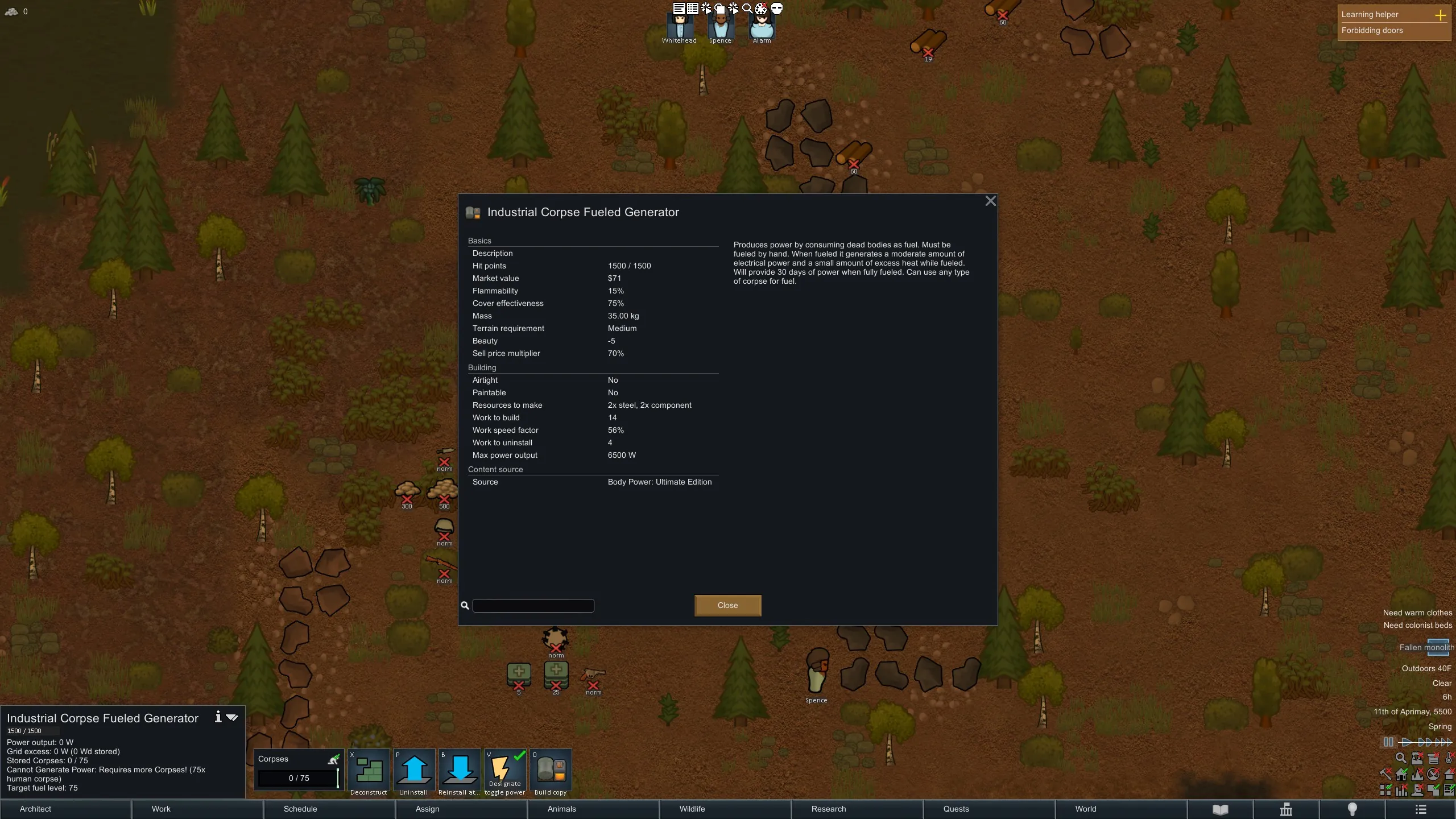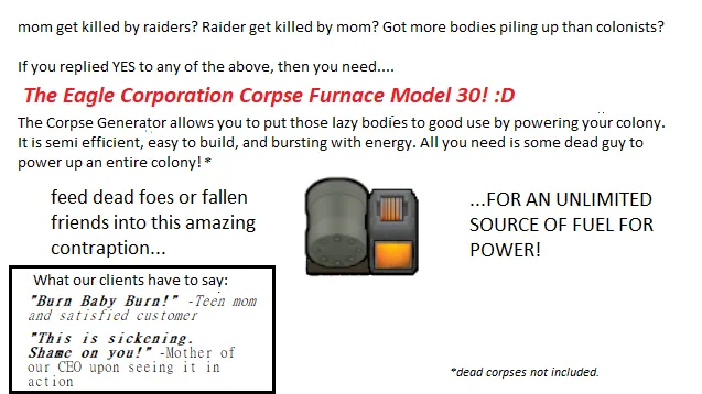 Adds a Generator which is powered by dead foes, to provide your colony electricity the right way!. Based on my other version, but this model produces less power per hour, and is easier to build, and is overall less overpowered