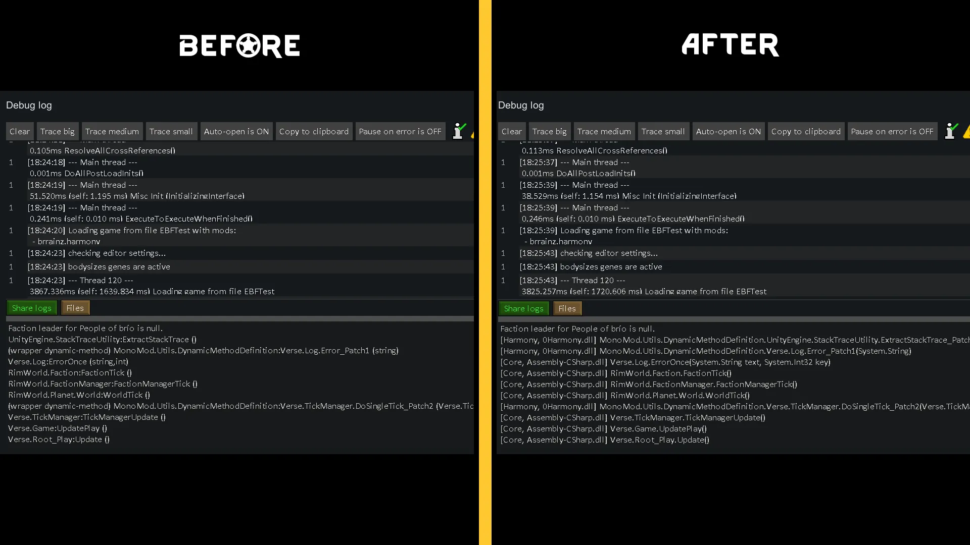 This overrides the default RimWorld stacktrace with my own.