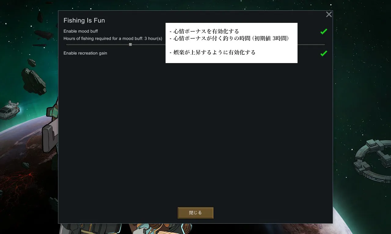 [*] 設定可能:気分上昇や娯楽の有効/無効を設定可能で、気分の上昇が開始される釣り時間もMod設定で調整可能です。