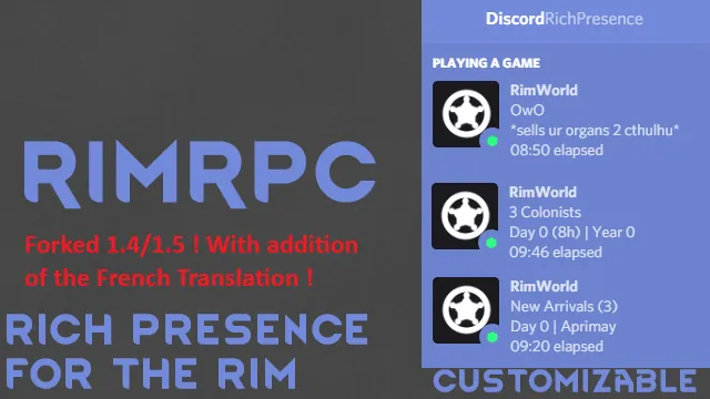 Thanks d1rknwh1te3 for 1.4 version : [url=https://steamcommunity.com/linkfilter/?u=https%3A%2F%2Fgithub.com%2Fd1rknwh1te3%2FRimWorldRPC]https://github.com/d1rknwh1te3/RimWorldRPC[/url]