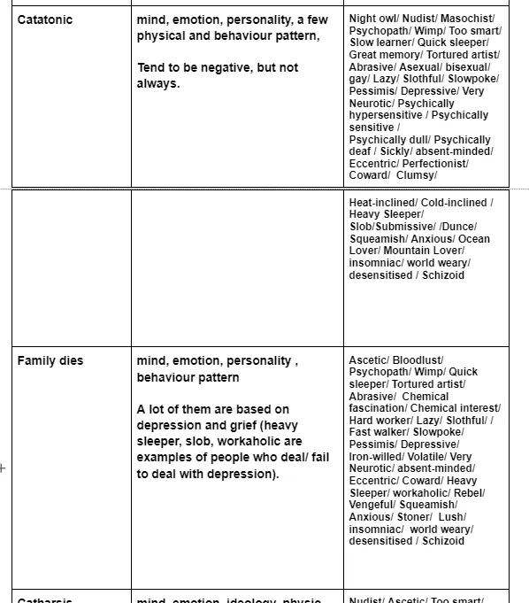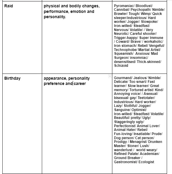In VSIE, a mechanic was introduced where pawns might obtain random traits after impactful life events. They are: