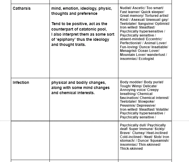 For example, ‘super immune’ ‘sickly’, ‘delicate’, ‘creepy breathing’ are categorised into the ‘infection event’ trait pool. This means after a pawn recovered from infection, when they trigger the trait obtain mechanic, a window consisting of ‘super immune’, ‘sickly’, ‘delicate’, ‘creepy breathing’ might pop up, and the player can choose one of them for the pawn.