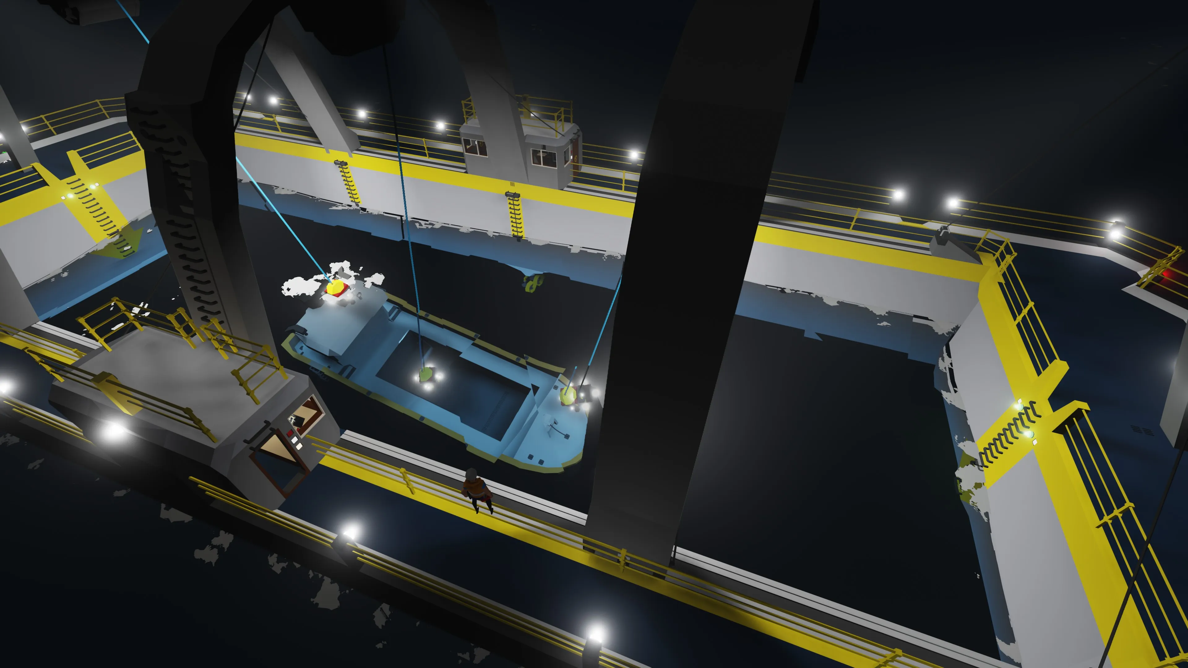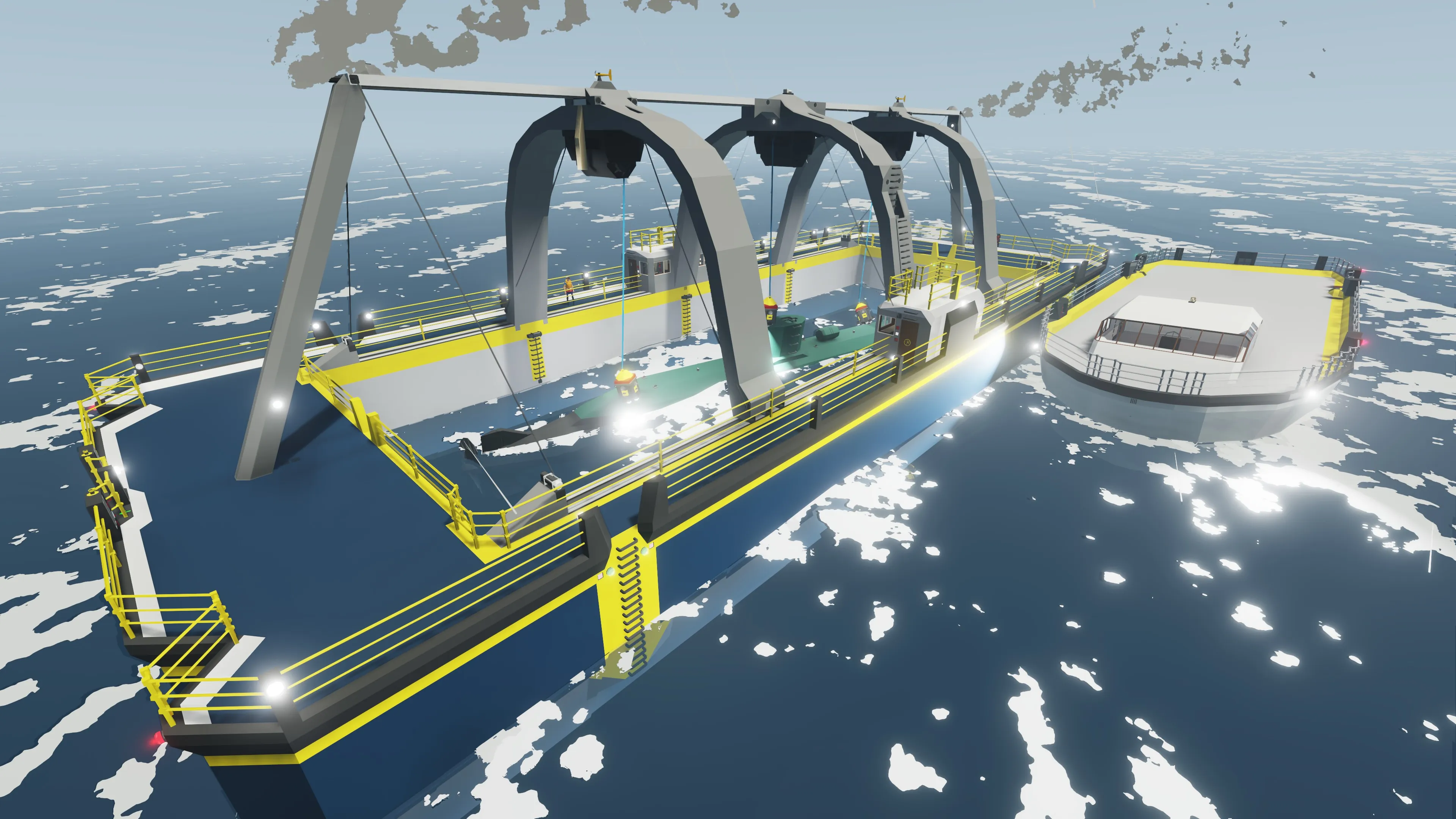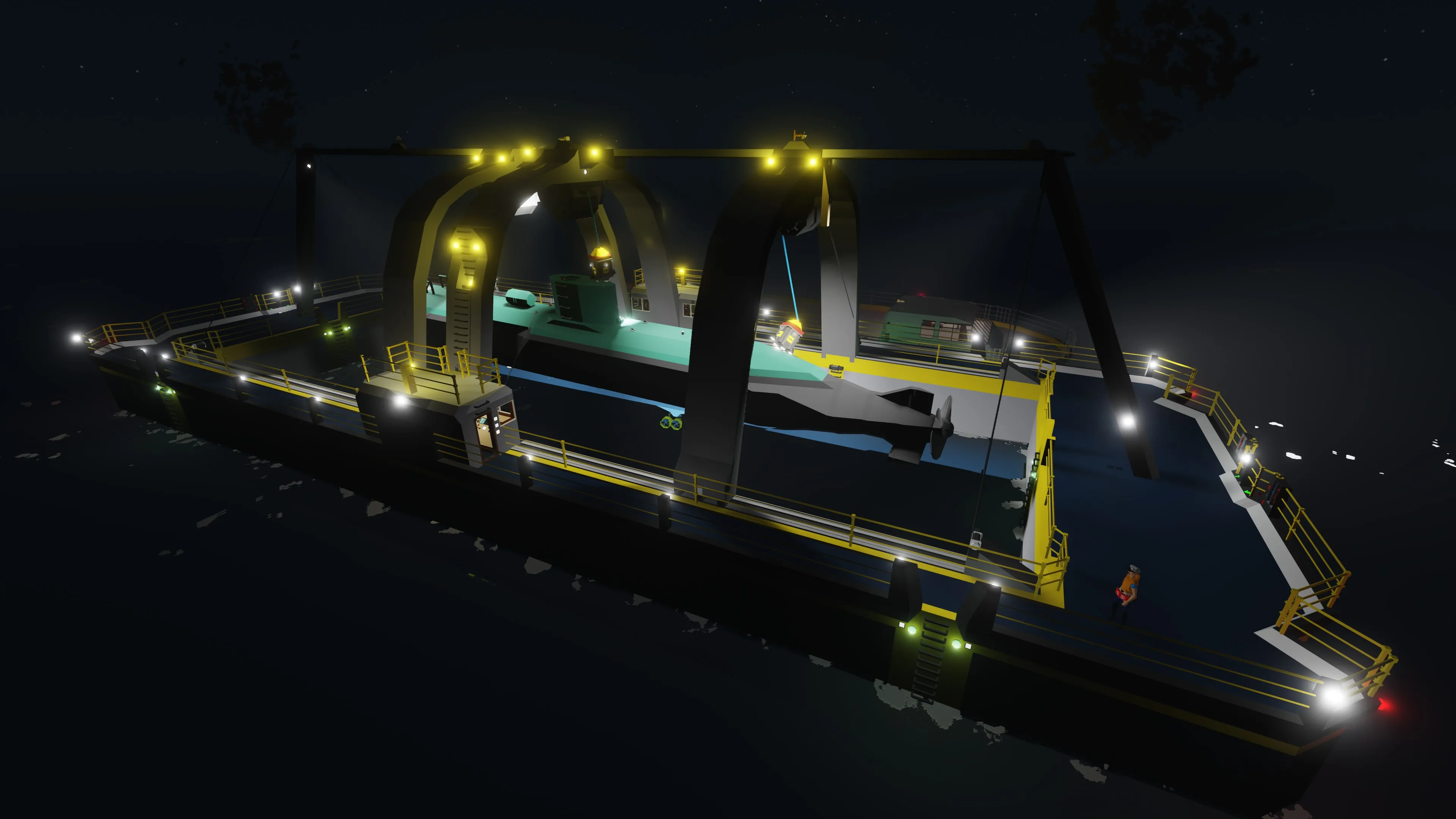 Once you have reached the drop off location, lower the necessary winches until the recovered vessel is just below the water level, detach the securing winches, detach the supplementary winches and then disable the mag alls.