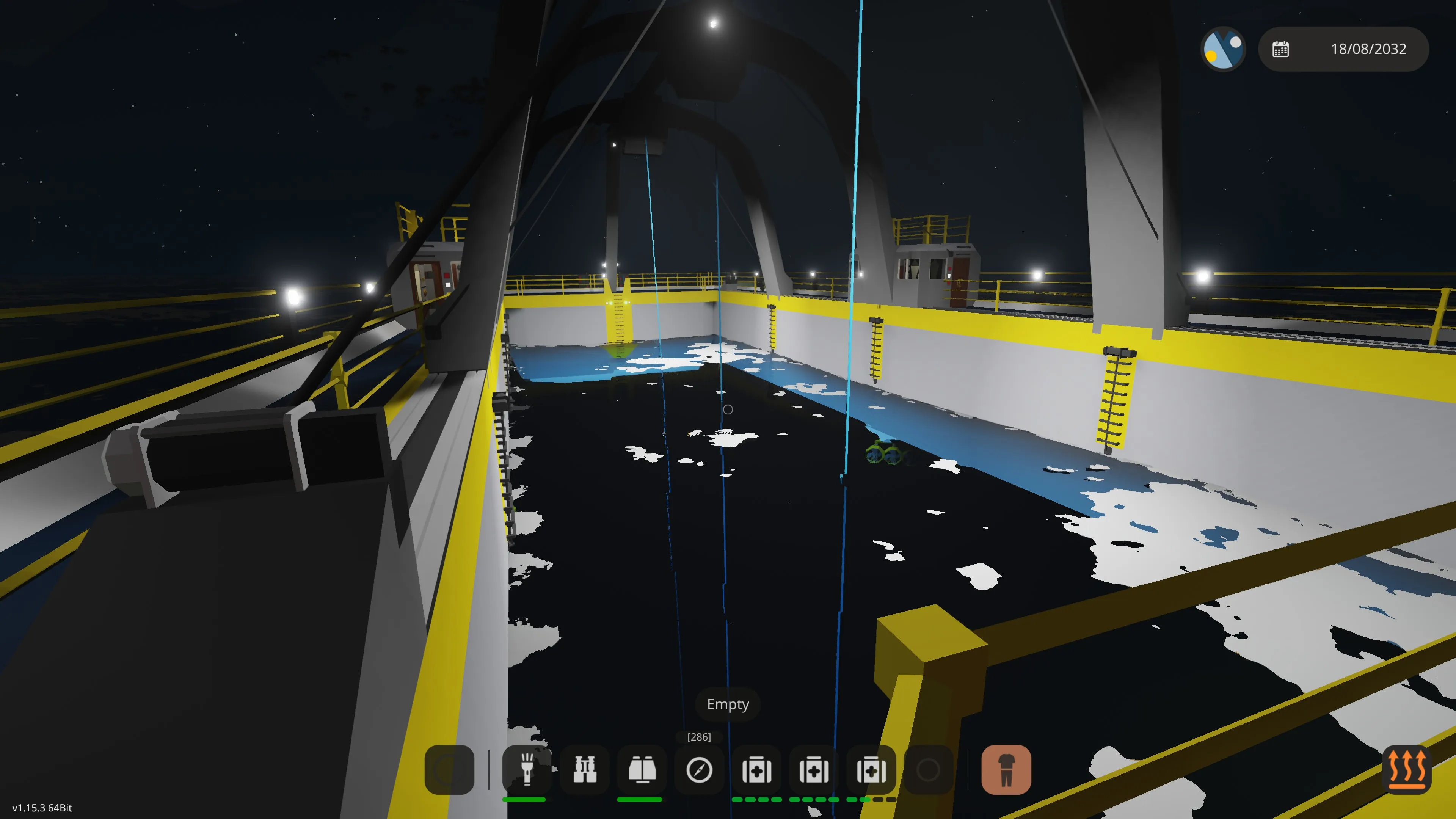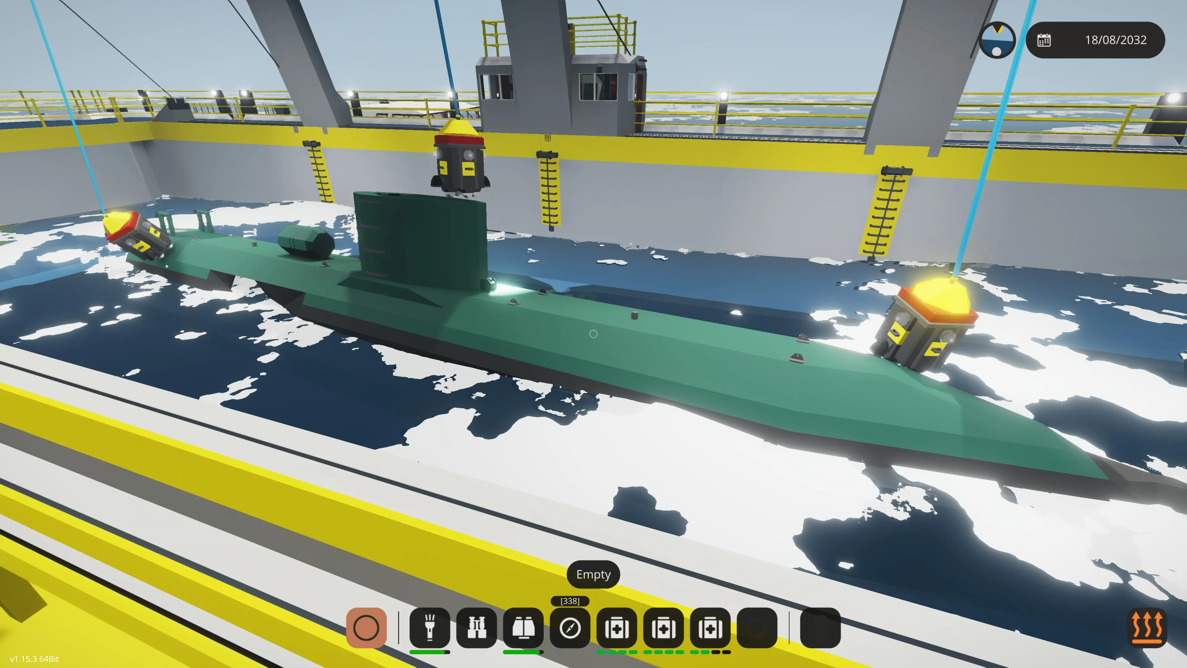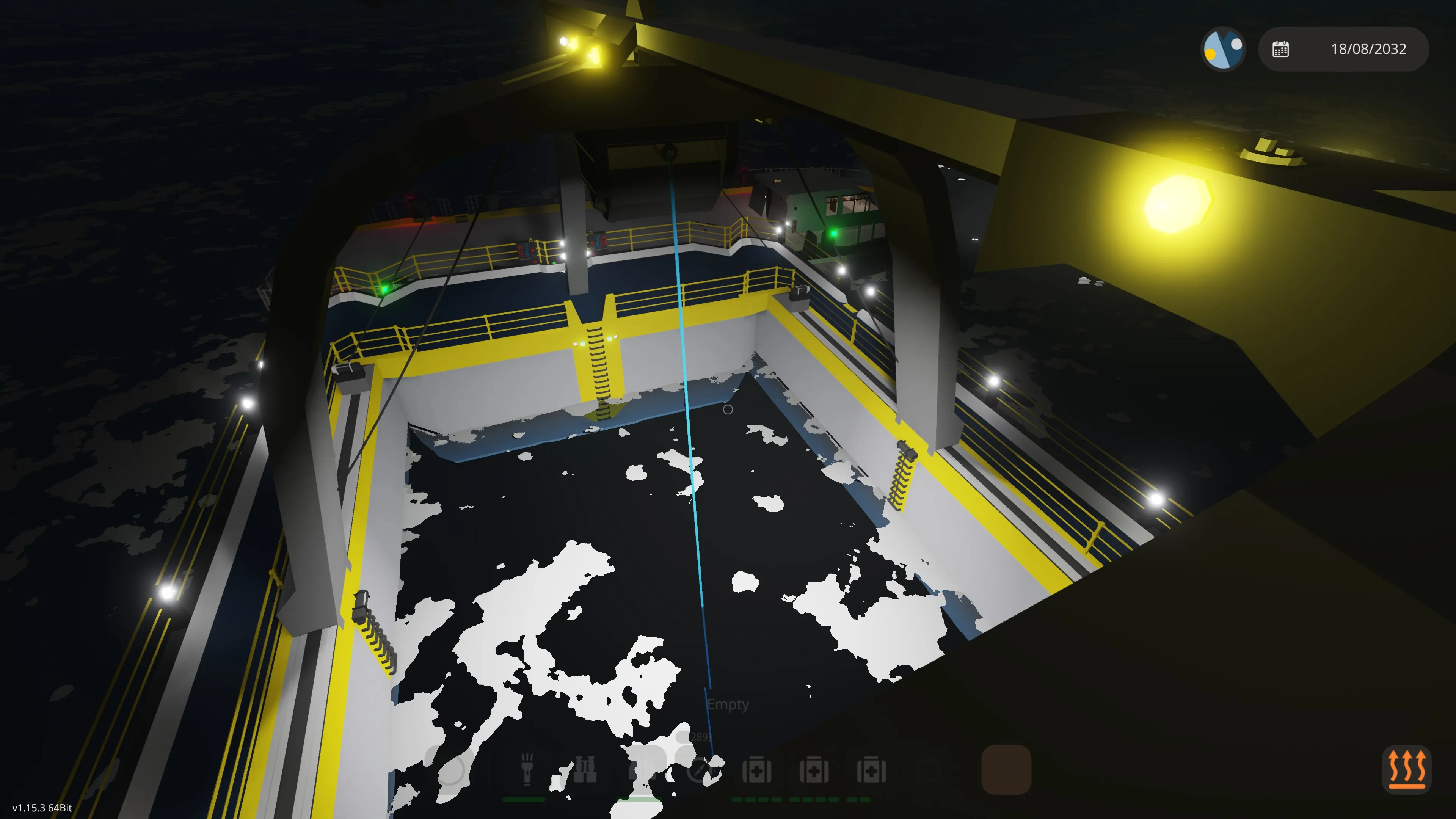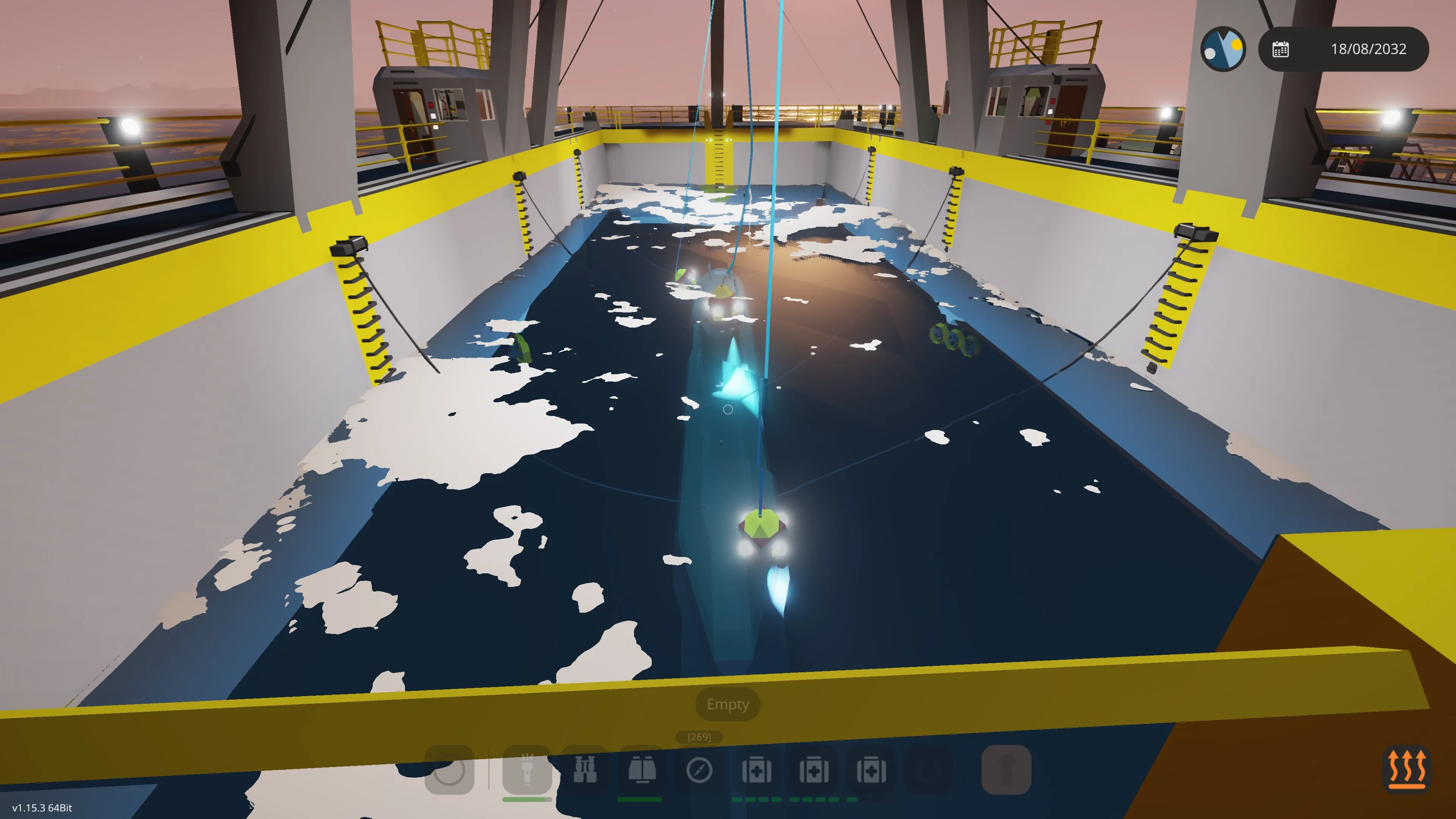Enable the winch anchor lights and lower the three main winches that have the mag all connectors (the winch anchors) on them. The winches can be lowered simultaneously, or one at a time. Turn on the mag alls and if you have positioned yourself correctly they will lock on to the vessel to be recovered. There are cameras on the winch anchors to assist with this. The bow and stern cranes can also be moved to take into account the length of the vessel. You may have to dive down and manually position the winches (they have handles on them) if the waters are rough. If you do this, disable the mag alls, dive down and position the winch anchors manually. Go back to the surface, if you have enough slack, the winch anchors should remain in position. Then enable the mag alls and they will lock on.