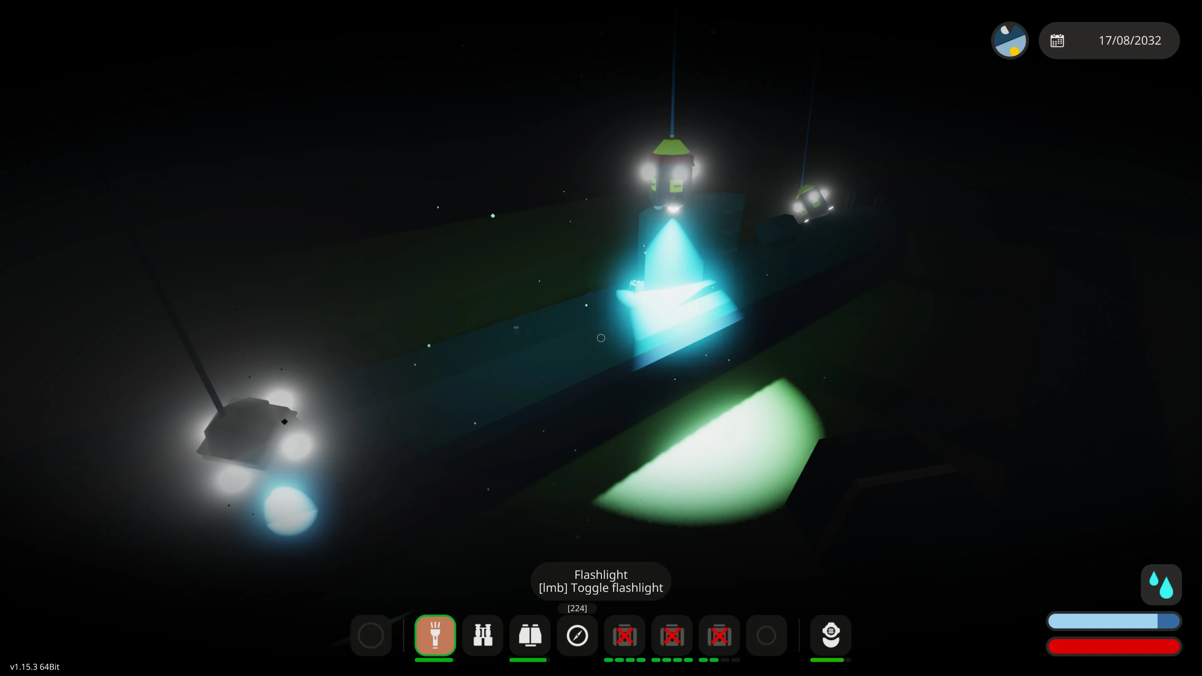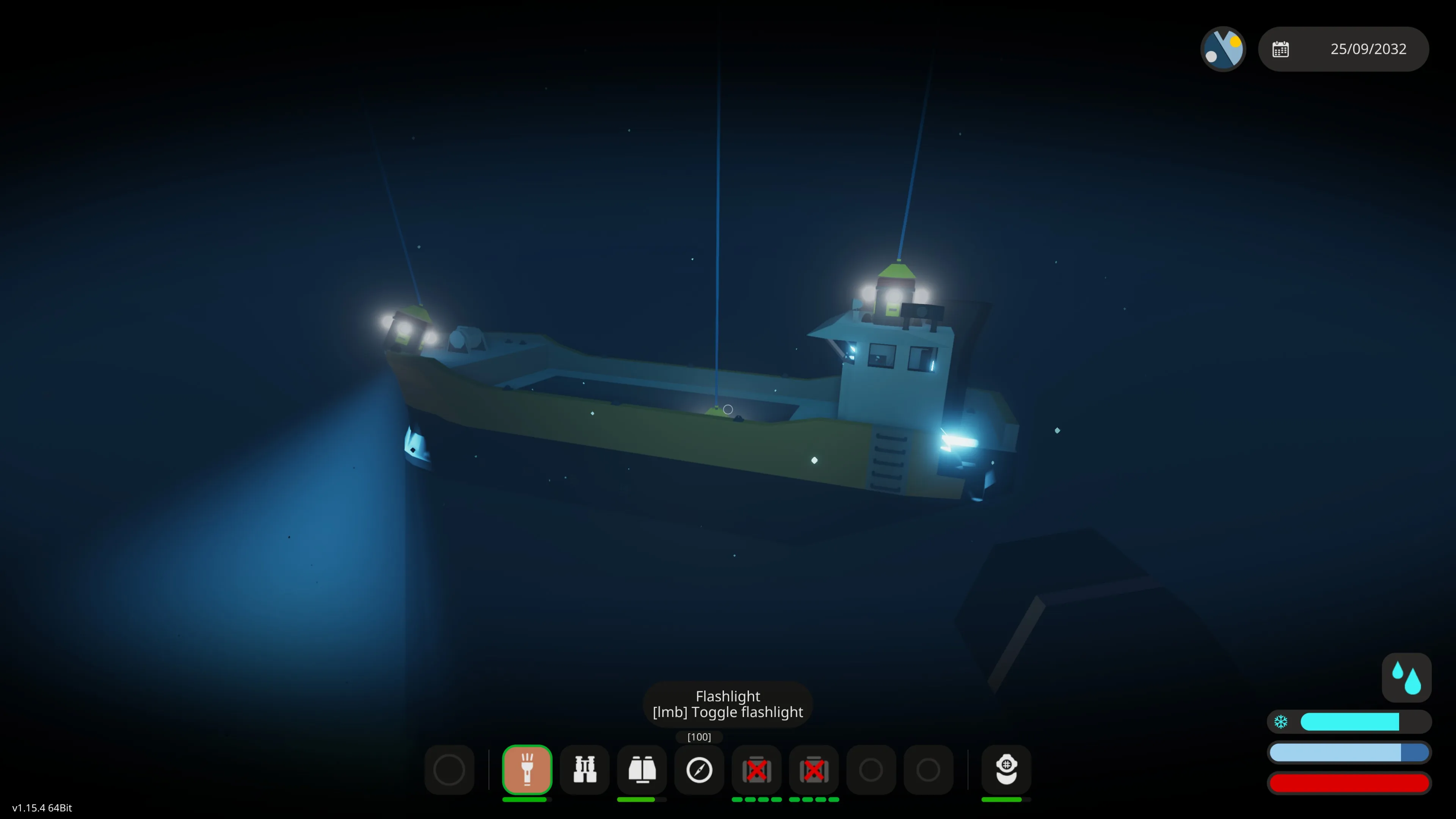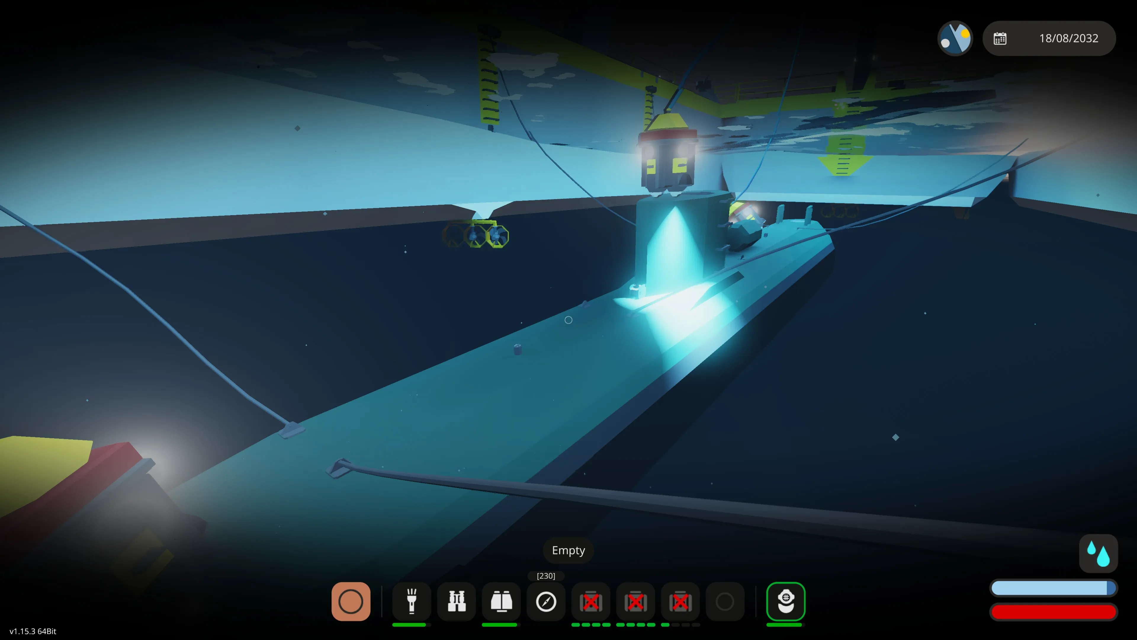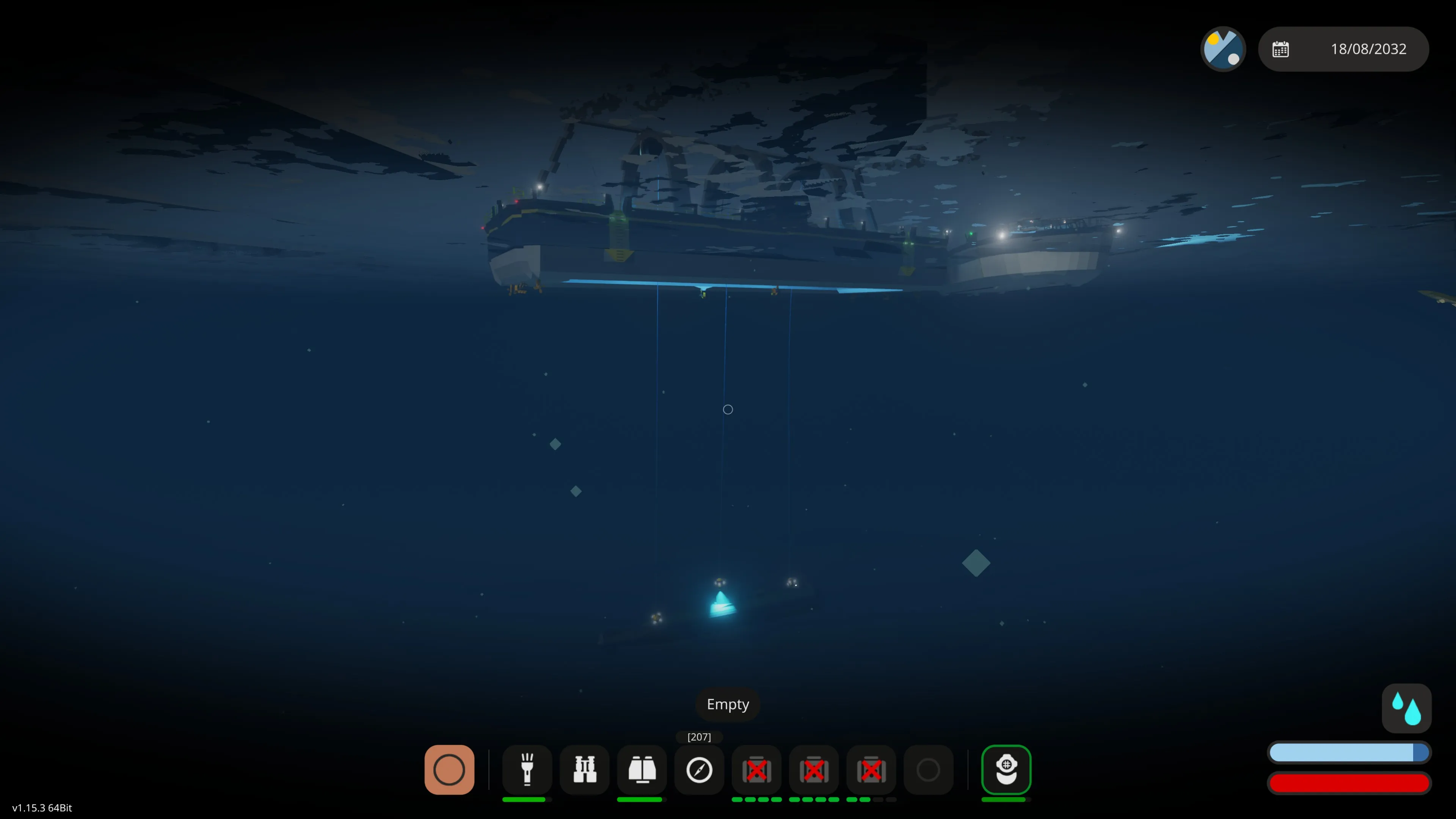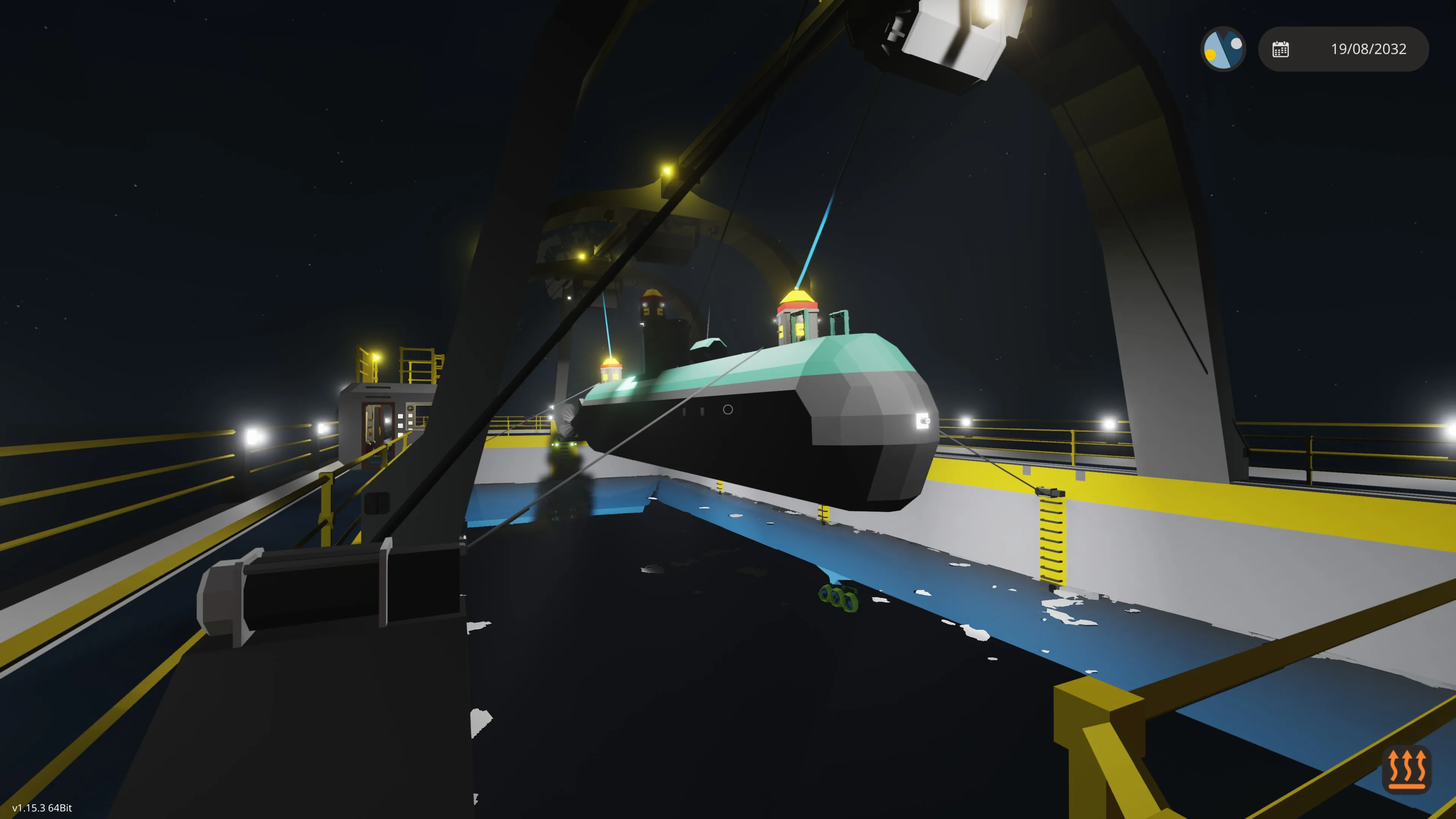 Enable the winch anchor lights and lower the three main winches that have the mag all connectors (the winch anchors) on them. The winches can be lowered simultaneously, or one at a time. Turn on the mag alls and if you have positioned yourself correctly they will lock on to the vessel to be recovered. There are cameras on the winch anchors to assist with this. The bow and stern cranes can also be moved to take into account the length of the vessel. You may have to dive down and manually position the winches (they have handles on them) if the waters are rough. If you do this, disable the mag alls, dive down and position the winch anchors manually. Go back to the surface, if you have enough slack, the winch anchors should remain in position. Then enable the mag alls and they will lock on.