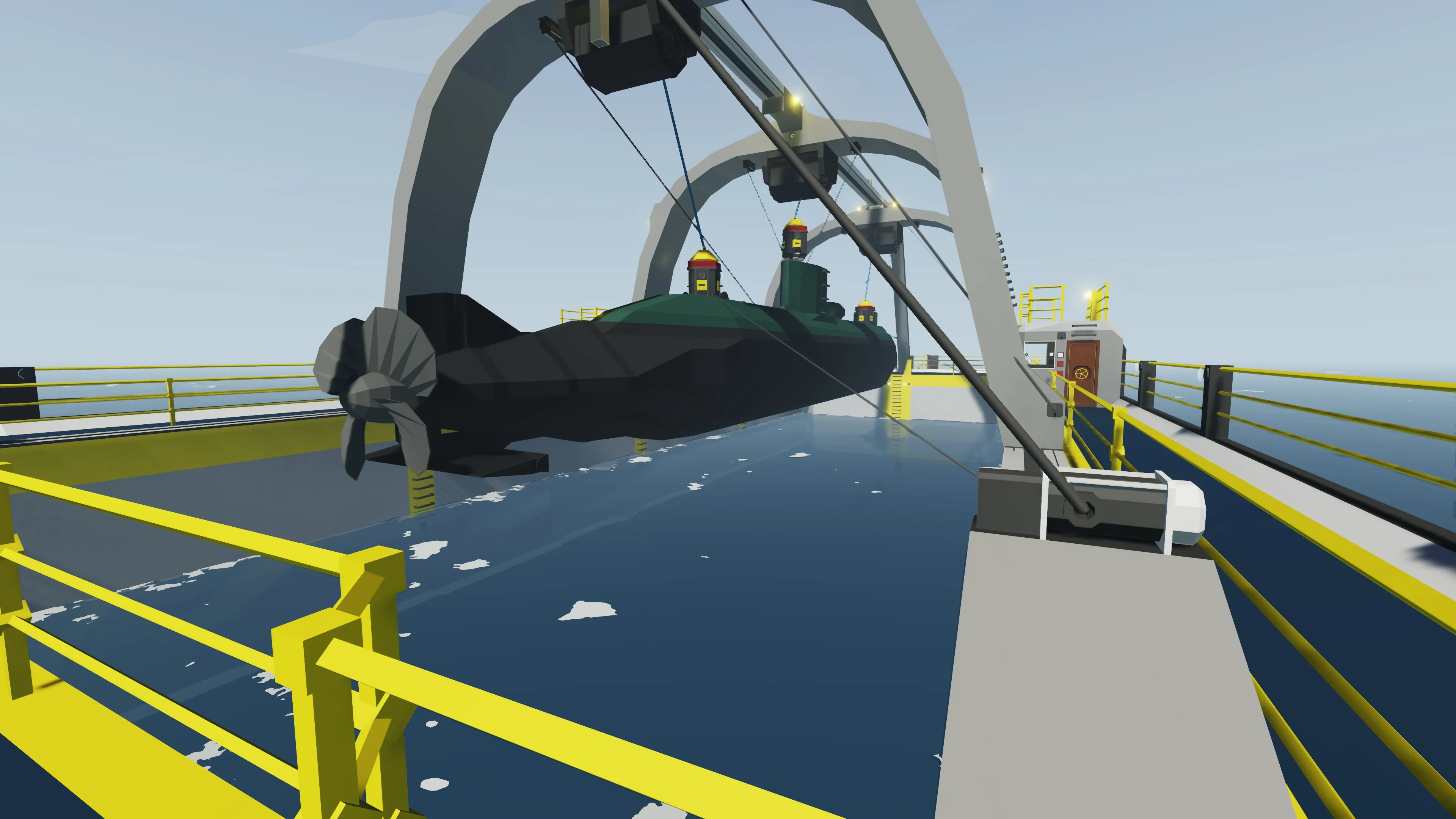 Raise all 3 winches until the vessel is just below the water line. The cranes have cameras also which can assist with this.