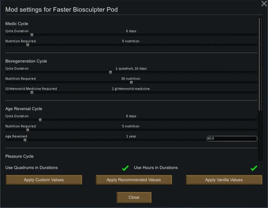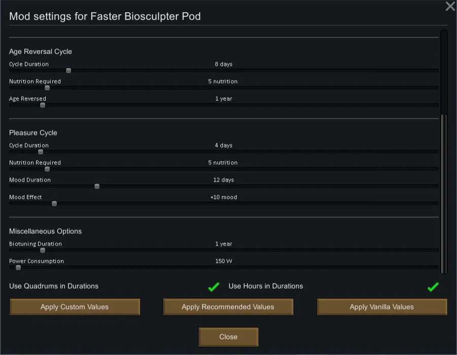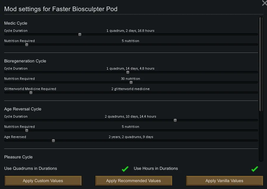 Want shorter cycle times? No problem. Do you hate biotuning? Lower the cooldown on it, or set it to zero to disable it completely. Want to offset your "cheating" by increasing the nutrition or power demands of the pod? Go for it!