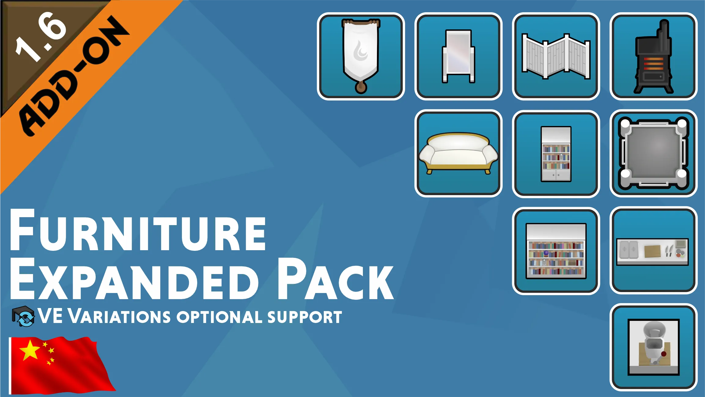 基于[FM] Furniture Expanded Pack翻译,所有权利属于原作者。 以下为mod简介: 为Vanilla Expanded Furniture制作的非官方附加模组,新增了多种家具物品,包括可提升殖民者睡眠舒适度的镜子和隔断屏风、用于装饰房间的各类橱柜,以及节省冷藏库空间的绞肉机等实用设备。