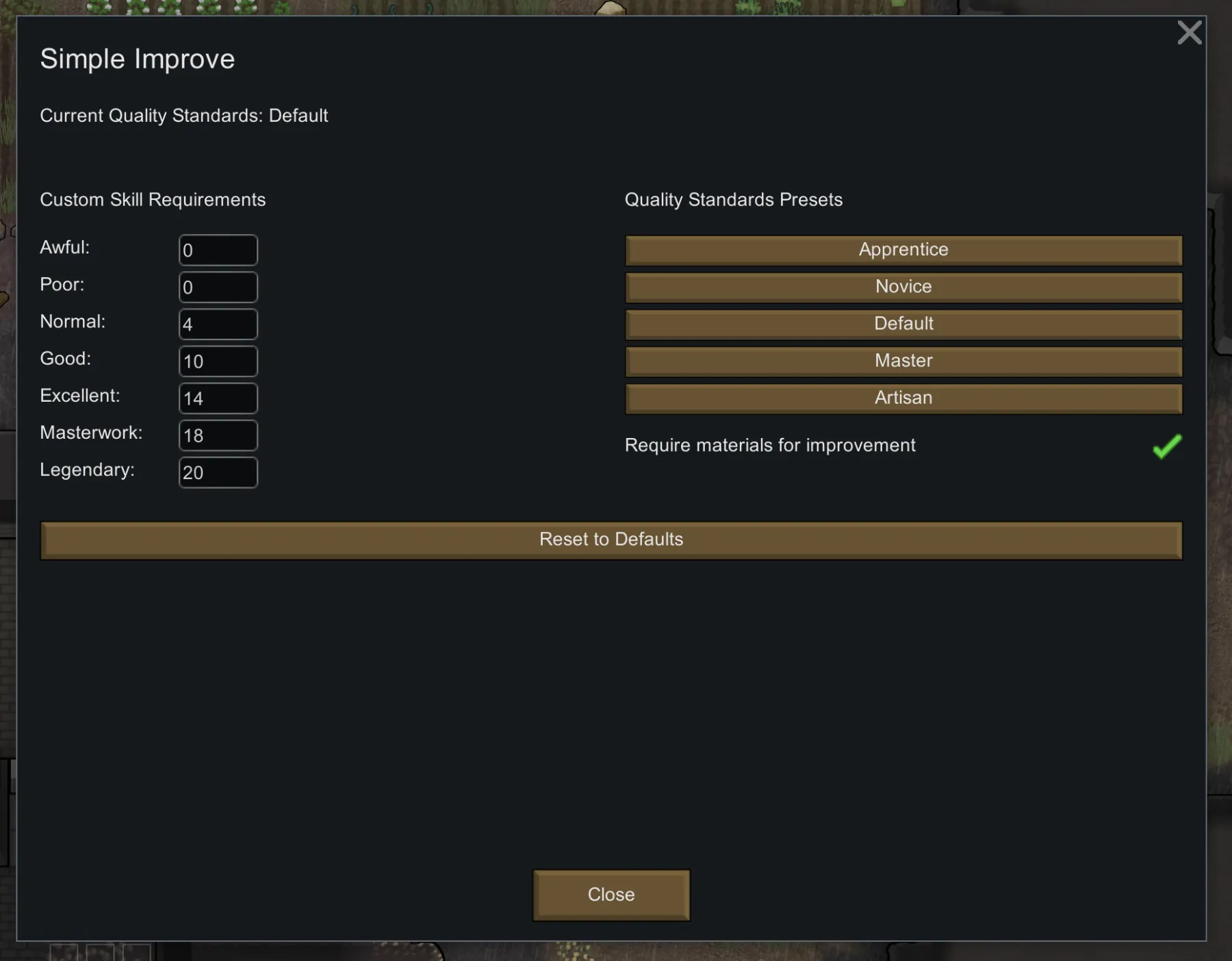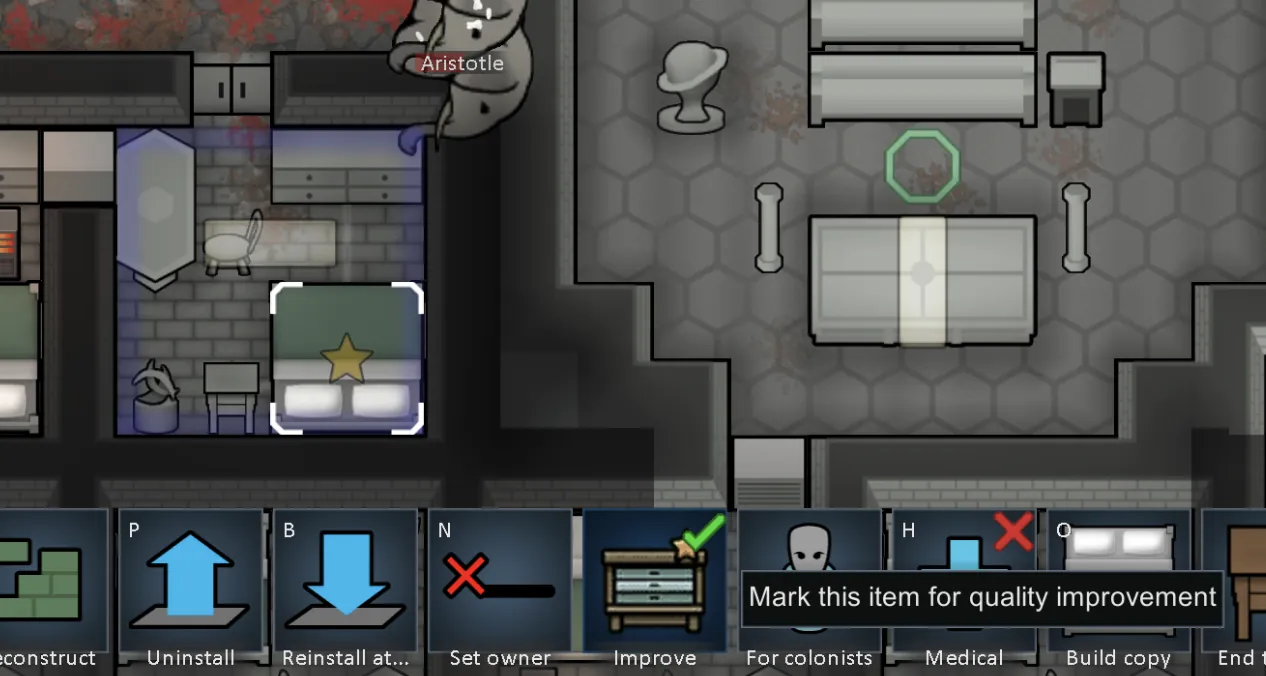 Transform your colony's infrastructure over time! Simple Improve lets you upgrade the quality of furniture and other buildings with quality through skilled construction work.