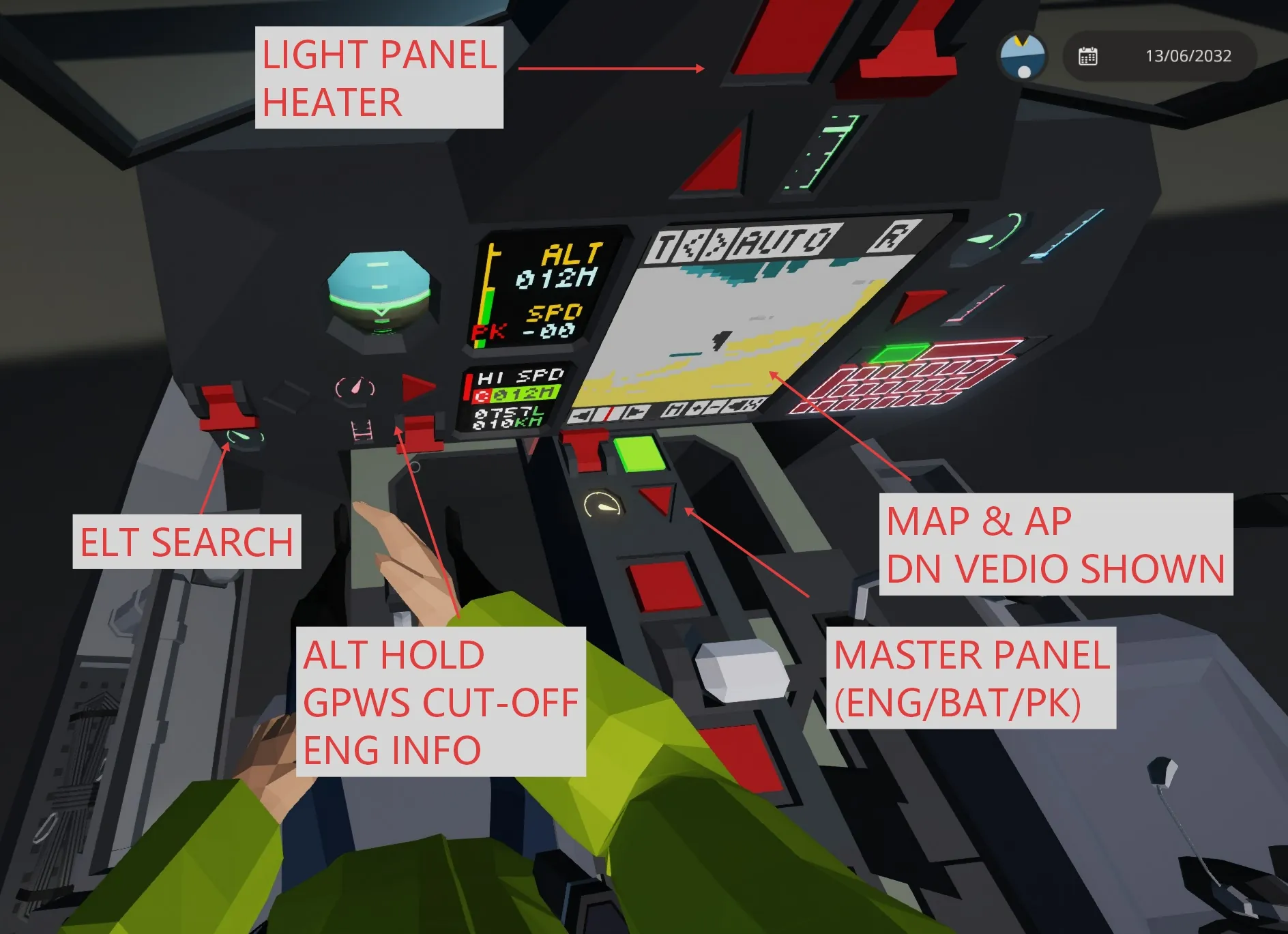 起飞、降落、停留刹车等推力手柄位置会在高度、速度显示器上标注“UP,DW,PK”(PK在高于3米离地后仅预位)
