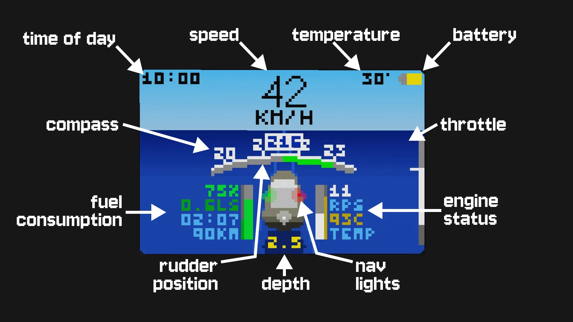 [*] Choose which data to display and which to hide: speed, depth, time, temperature, fuel level, battery status, navigation lights.