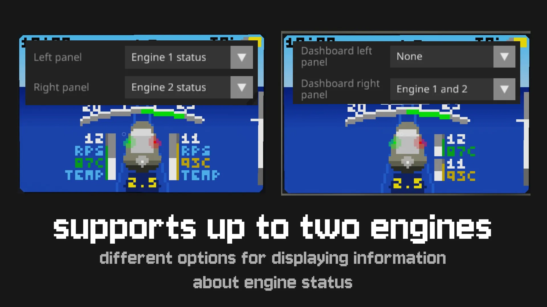 [*] Displays engine RPM (RPS/RPM) and temperature with color-coded overheating and overload indicators. [b]Supports up to two engines on your ship[/b]. You can configure the display to show data for both engines separately or combined.