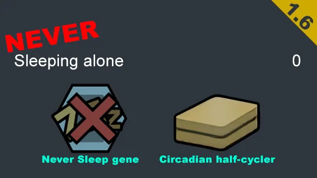 This mod negates the '-4 Sleeping Alone' mood debuff for anyone with the 'Never Sleep' gene. I made this because I wanted the pawns who never had to sleep to stop worrying about who they were never sleeping with.