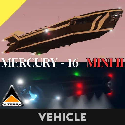 The Mercury - 16 MINI II is a half scale version of the original but its more lenient towards the attack side with a few extra features, inculuding VTOL, Submarine Mode, Space Capability, High Maneuverability, LIDAR, TIMRA (Twin Internally Mounted Rotary Autocannons), Automatic Anti Missile Chaff System, a large cargo bay with airdrop capabilities.