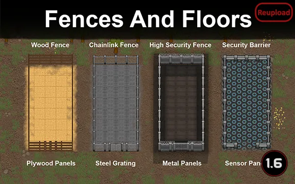 This mod adds 4 new styles of flooring and 4 fences (3 perimeter fences and a smaller defensive barrier). Fences are gathered into their own menu category and research requirements have been applied where appropriate. Plywood paneling and the simple wood fence are available from the beginning and are relatively simple to construct. Upon completing the Machining research requirement access to chainlink fencing, high security fencing, the security barrier, steel grate flooring, and metal panel flooring is made available. The last addition, sensor panel flooring, becomes constructable upon completing a new research project: "Reactive Flooring."