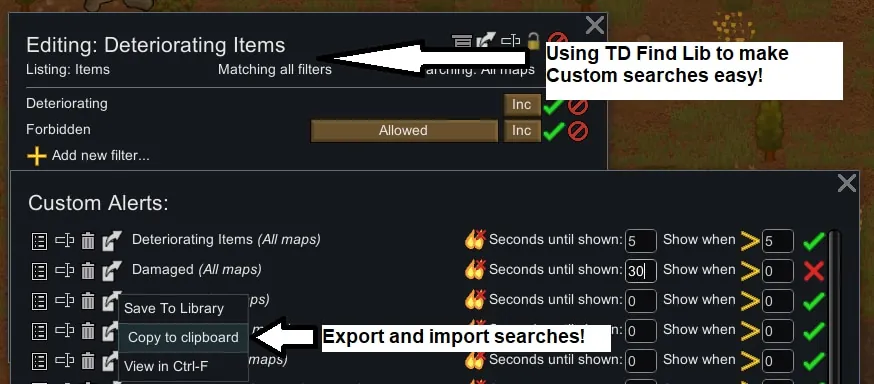 This mod uses the framework mod [b][url=https://steamcommunity.com/sharedfiles/filedetails/?id=3529443295]TD Find Lib[/url][/b] to allow very detailed filters to find what you want. For more details on how to use its features, check out that mod page.