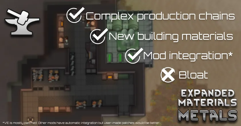 Expanded Materials - Metals is a mod that aims to add complexity and difficulty to the gameplay experience of Rimworld by adding new metal resources such as iron or copper. The mod is aimed to be integrated with the vanilla game and some of the most popular mods out there. You can expect more complex production chains and more immersive gameplay, especially if you are seeking for a challenge and variety.