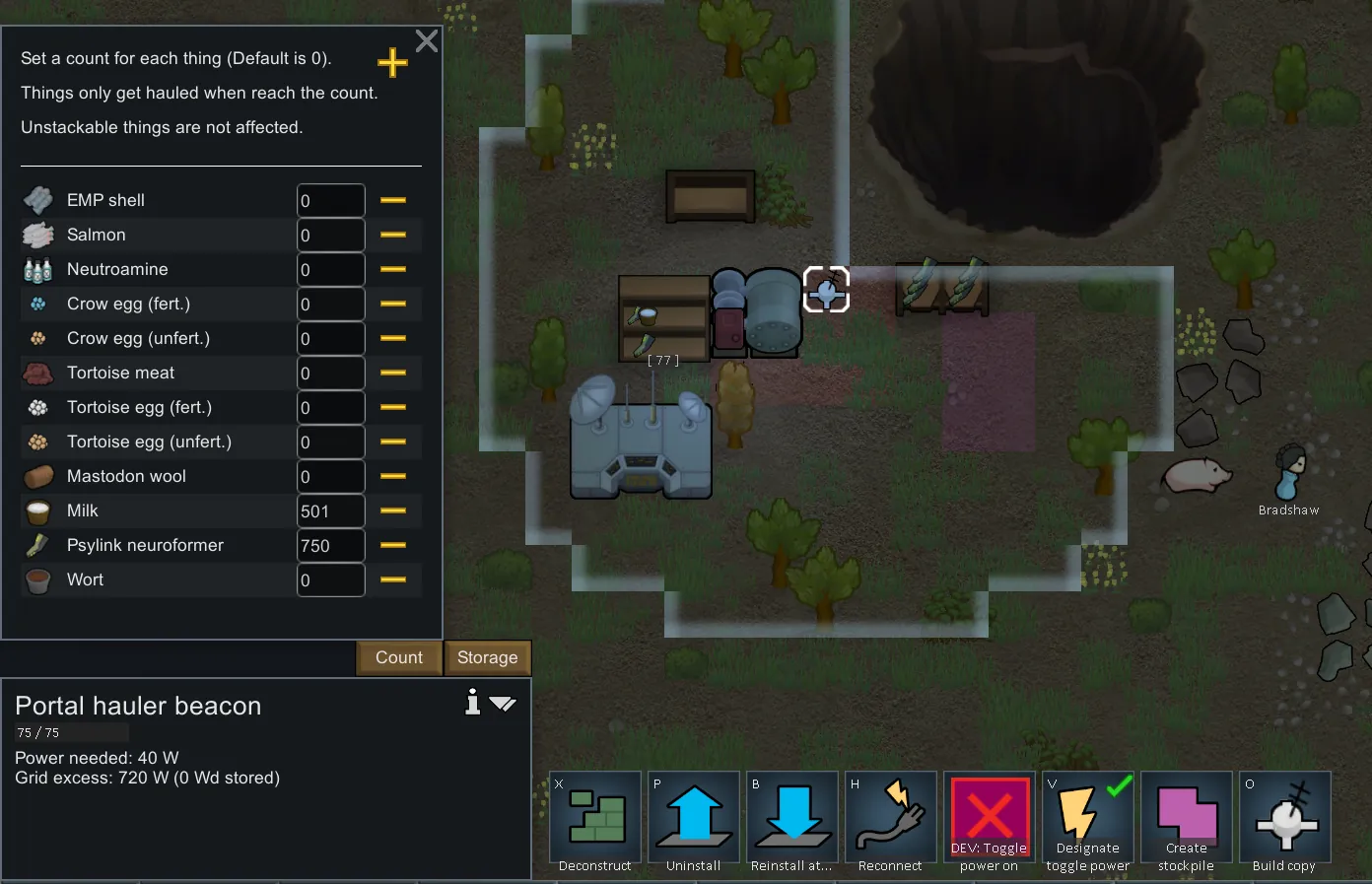 Also, you can set a count for each kind of item. The hauler will haul it after it reaches the count and will leave that number of items not hauled. See in picture. For example, if you set milk to 500, then the beacon will not haul until the milk around reaches 500. If you have 700 milk around, it will haul 200 and leave 500 not hauled.