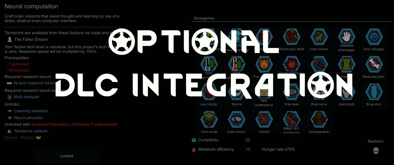 Starway was founded from colonies of scientists who were forced with the hard truths that they would have to eventually protect their claims with force. Enter the Starborn, a xenotype of cultured genes to create perfectly loyal soldiers ready to die for another's cause. The chairmen of Starway do not care what happens to the people they employ, butchering genetics in order to create a beast of a killing machine. (Biotech needed for the xenotype)