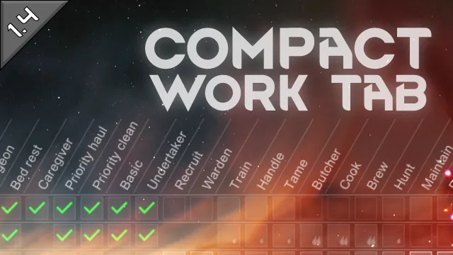 This mod has been tested and found to be nicely compatible with [url=https://steamcommunity.com/sharedfiles/filedetails/?id=1414302321]Numbers[/url], [url=https://steamcommunity.com/sharedfiles/filedetails/?id=1994006442]Priority Master[/url] and [url=https://steamcommunity.com/sharedfiles/filedetails/?id=2340773428]Grouped Pawns Lists[/url]. It's [i]technically[/i] also compatible with [url=https://steamcommunity.com/sharedfiles/filedetails/?id=725219116]Fluffy's Work Tab[/url] (from which this mod took inspiration), but if you run them both at the same time Fluffy's mod will override the functionality of this one, so I recommend you don't do that.