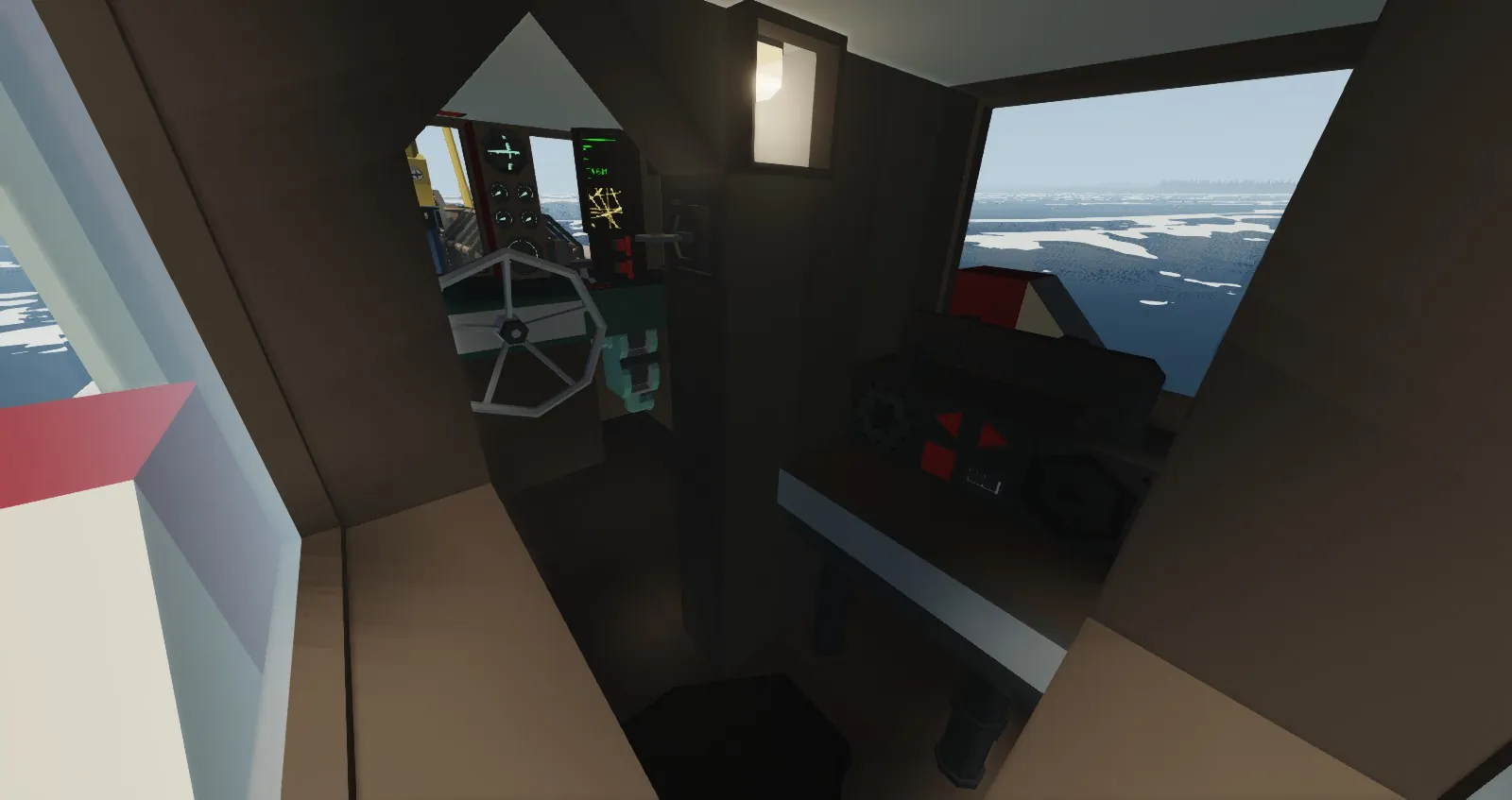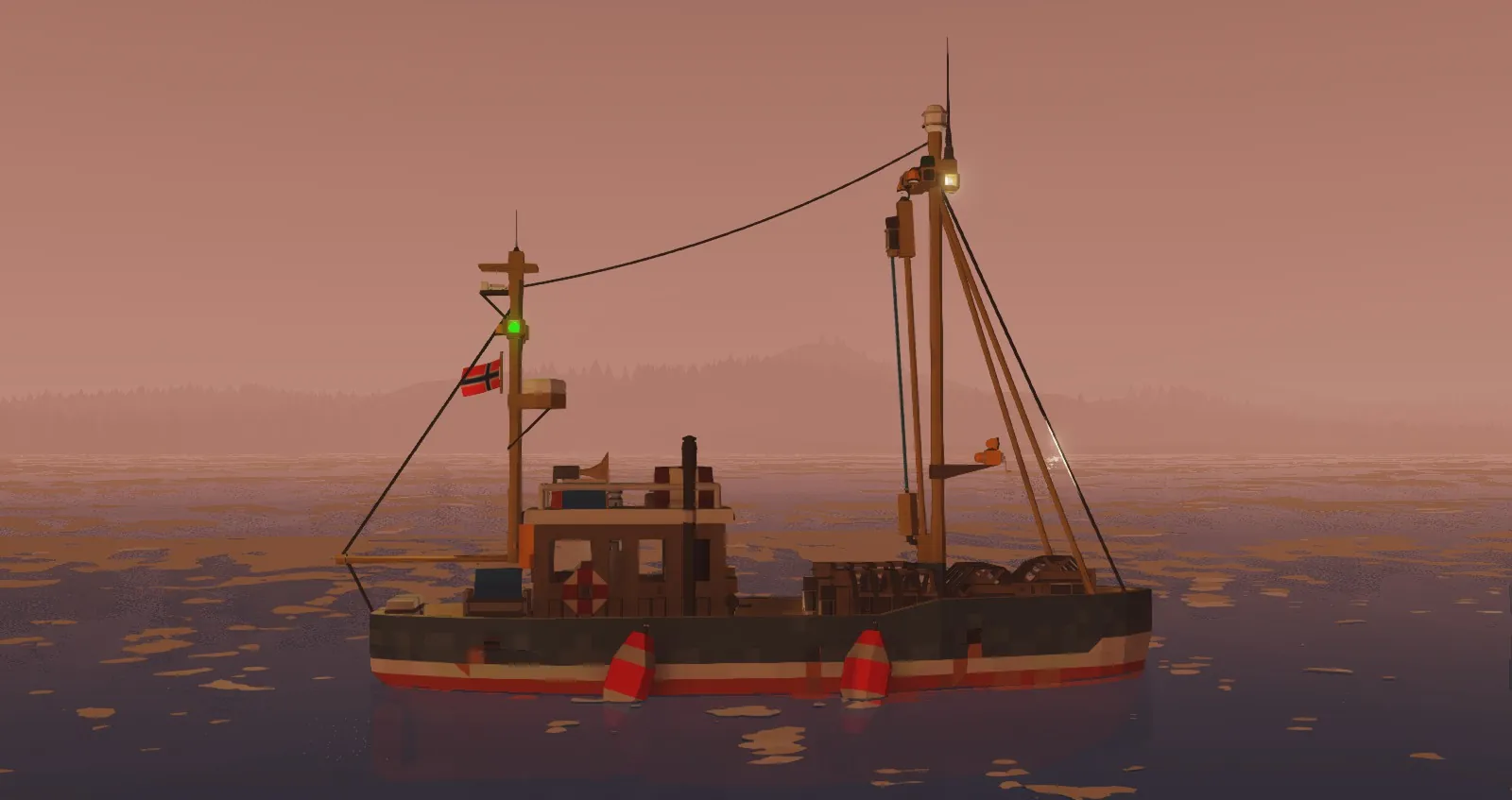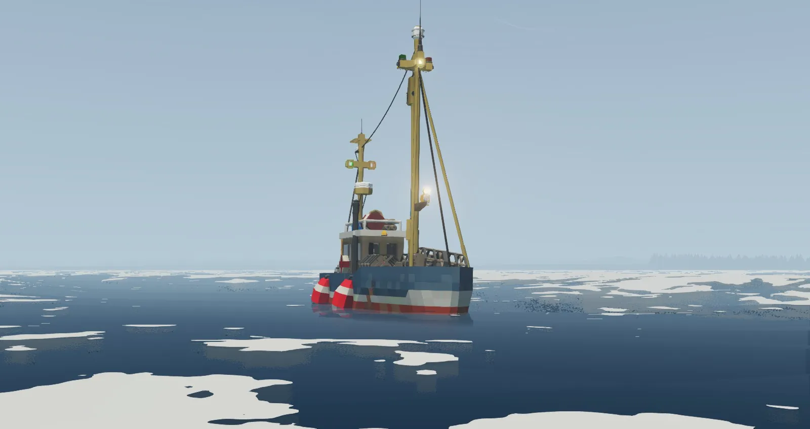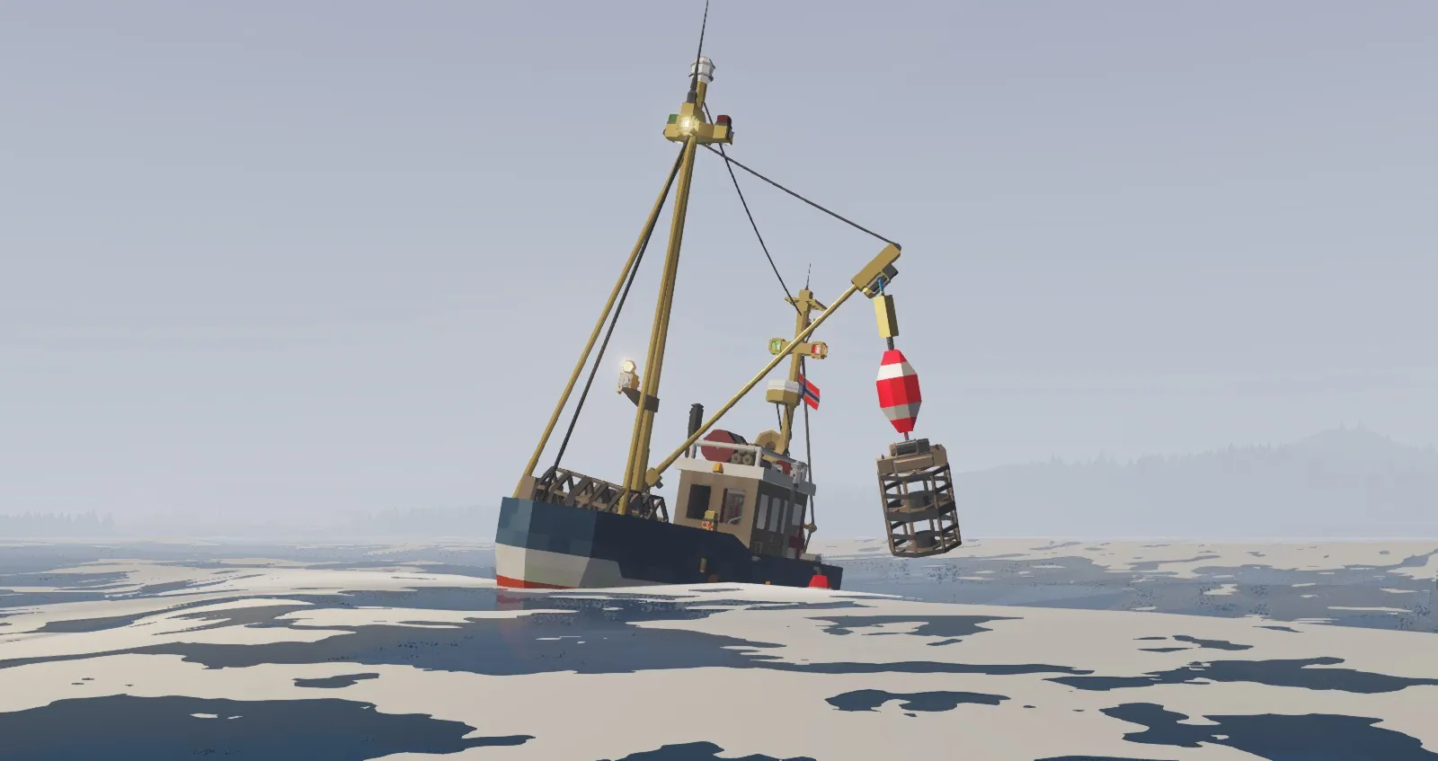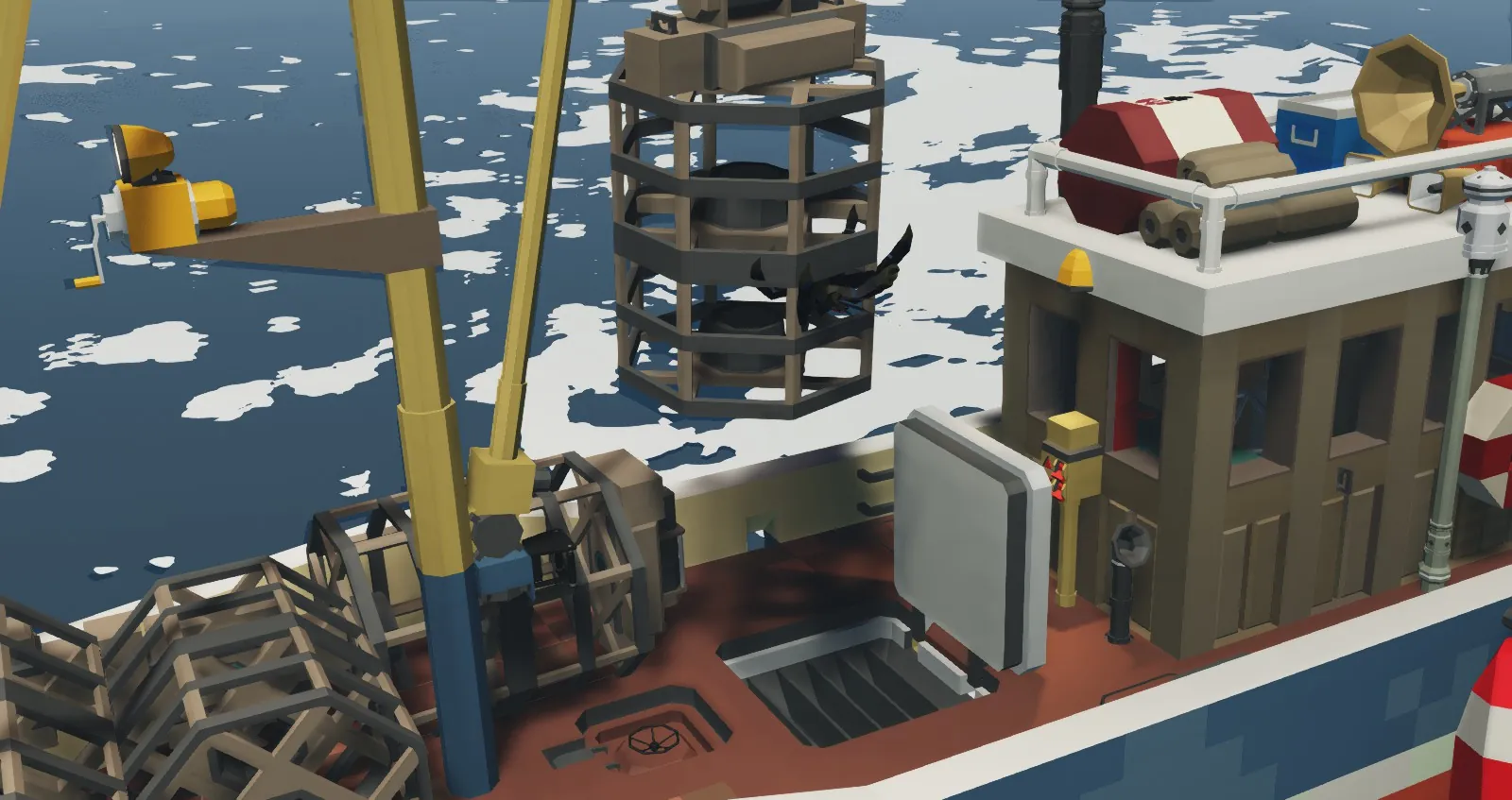 Crane: The crane is also rather easy, I like to think. Pull a buoy onto deck, connect the crane to it and hoist it slightly into the air. Then, pull an electric cable out from the cable hatch, which sits in front of the cooler hatch. Connect the cable to the bottom of the buoy, then connect the buoy to a crab pot of your choosing. Use the pot-winch-block (mounted on the wheelhouse's external wall) to reel the pot up. Then, return to the crane control handle, swinging the pot to whichever side you would like to drop it, lower the crane and hook until the buoy is mostly submerged (taking care to keep the ship's center of gravity in mind), then once again return to the pot reeler. Lower the pot until it touches bottom - visible by your buoy raising in the water, and tension in the crane arm releasing. To pick up the crab pots, it should be rather self-explanatory. An important note is that 40M is the absolute max depth this ship can pick up pots from. I recommend dropping at a depth of 30M, and use caution while it's windy. Try keeping it pointed into the wind while idle. Tested up to 50% wind at 50M.
