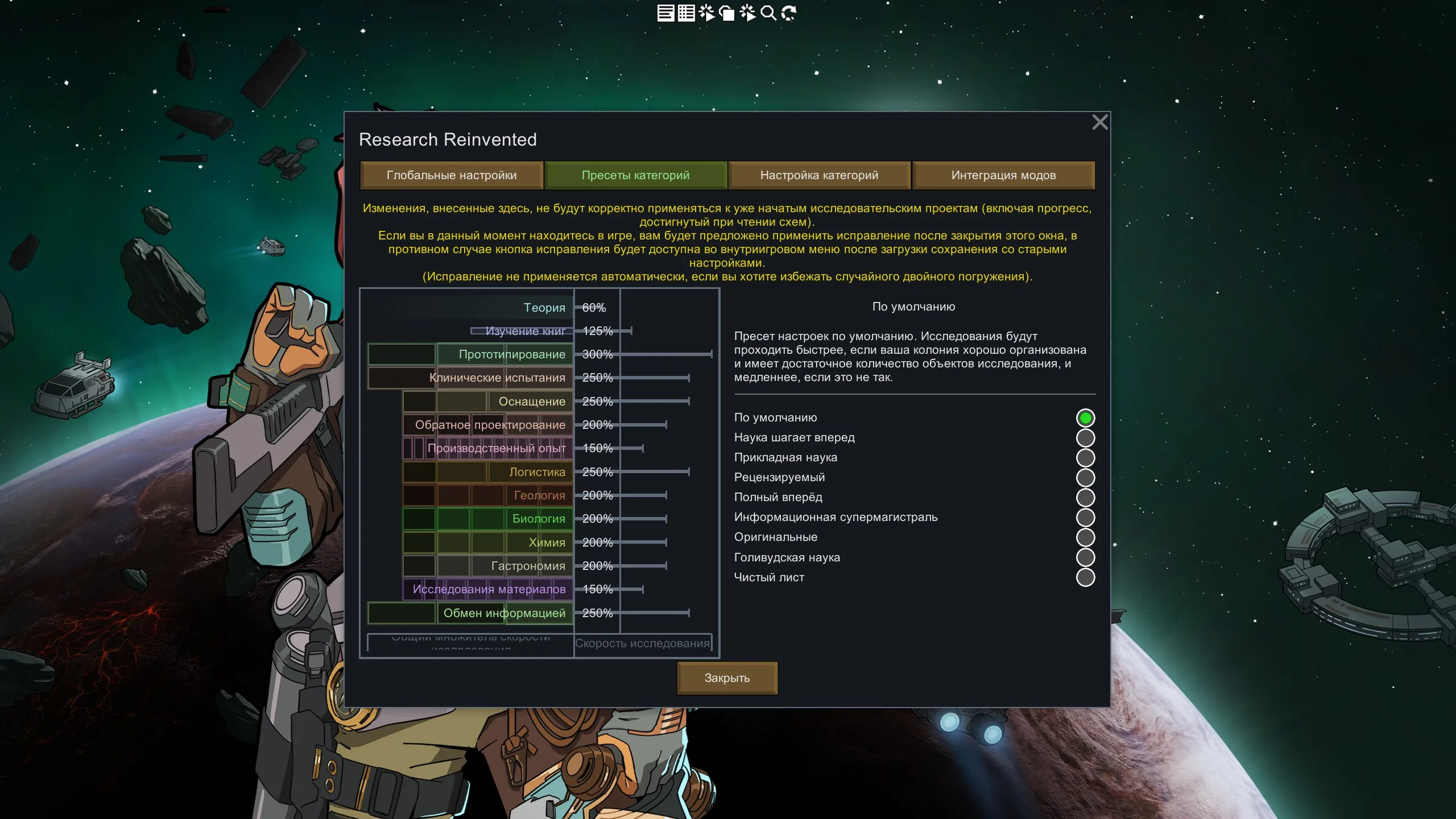 Использование таких возможностей для исследований может значительно ускорить ваш прогресс в исследованиях. Однако, если таковых нет, то исследование резервной теории эквивалентно по скорости обычным исследованиям (эта скорость может быть снижена в настройках мода, если вы предпочитаете стимул для поиска новых возможностей).