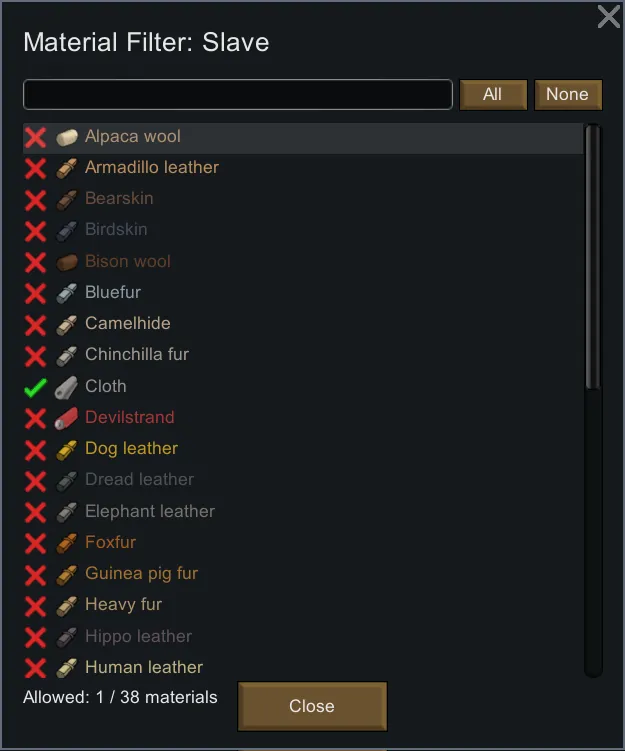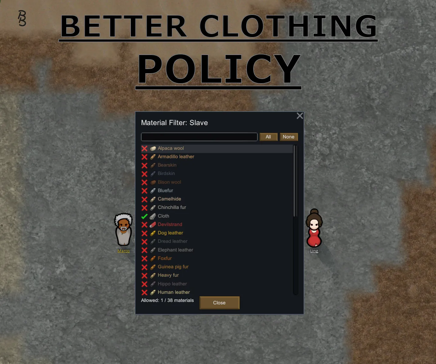 Adds material filtering to apparel policies. Control which materials (cloth, devilstrand, leather, etc.) your colonists are allowed to wear based on their assigned apparel policy.