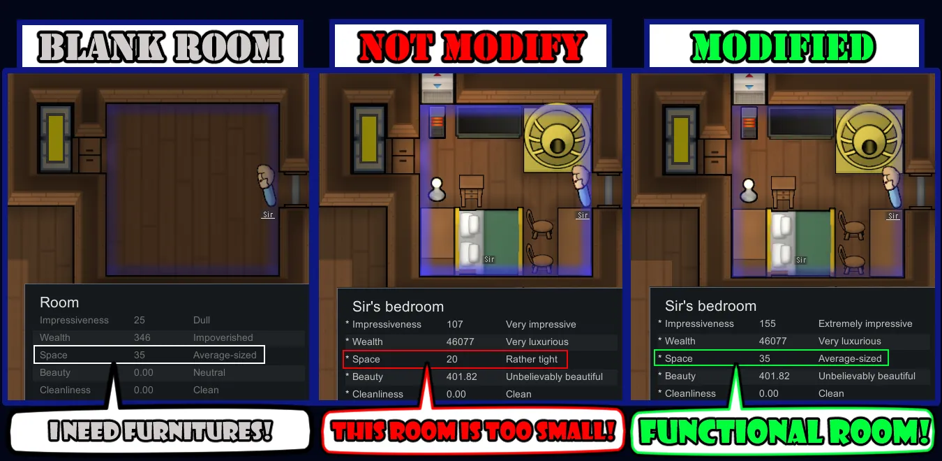This mod prevents the room Space rating from being lowered by furniture occupancy.