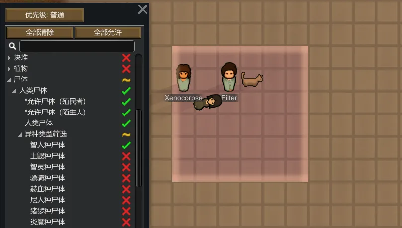 本模组为存储区和生产建筑配方增加了按“异种类型”筛选类人尸体的功能。