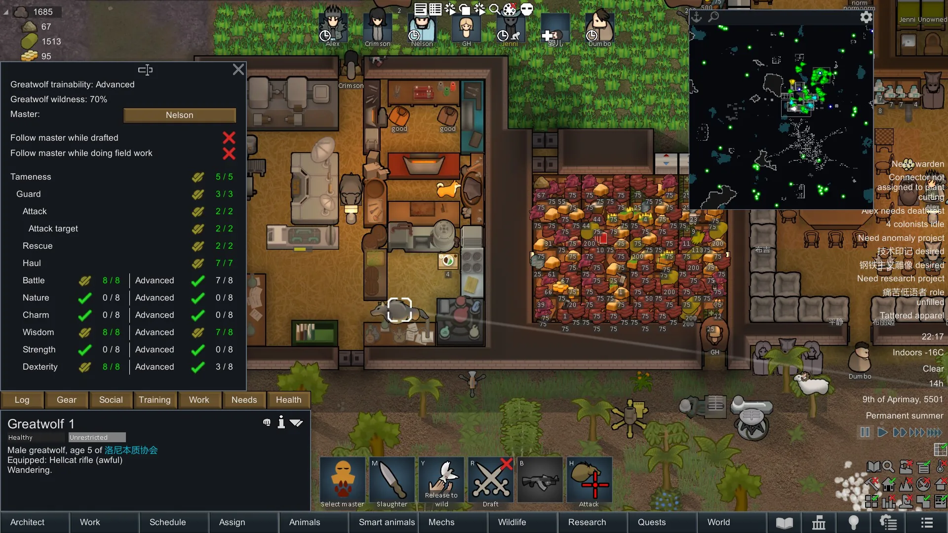 Smart animals can be drafted and can equip weapons. Similar to the relationship between the mechanitor and mechs, animals cannot be drafted without a master or when their master are downed, and cannot leave their master too far away (mainly to prevent them from being too op).