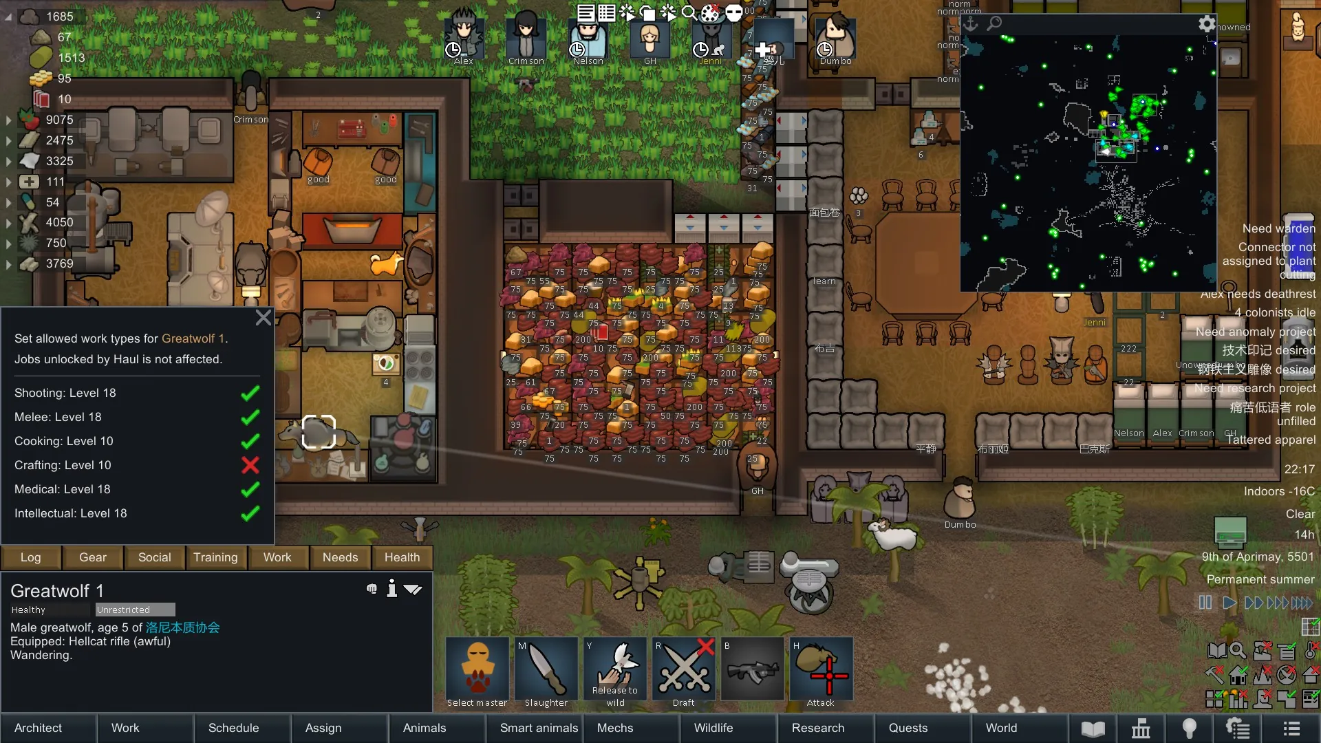 When an animal is working, there will be a button next to it that allows you to cancel the work. Apart from this, the work of the animal is still uncontrollable and the animal may slack off. Feeding animals with lavish or fine food will increase the probability of them working, while feeding them with nutritional paste or baby food will increase the probability of them slacking off.