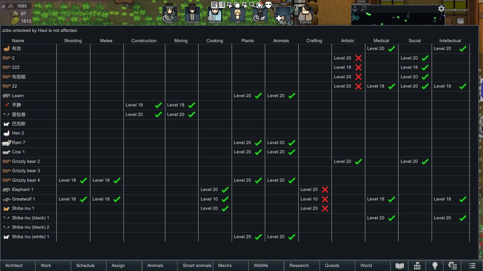 Animals that have learned new trainings can do work with corresponding skills, and there will be an additional work tab next to the training tab, allowing you to disable the work of the corresponding skill for this animal. In addition, the mod settings allow you to enable the smart animal column tab, which can directly view the disabled work of all the smart animals in the entire colony. (See picture) Finally, you can also directly disable a specific work in the mod settings, which will take effect on all animals.