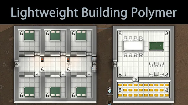 This mod adds a new building resource called Polymer. It's extremely lightweight, very delicate, cheap to produce and extremely fast to setup. The idea of this material is to make it easy to setup temporary mining bases or outposts. Normal materials are extremely heavy and take a fairly long time to build. With Polymer you can carry all the resources you need for construction and get a base up and operating within a day. Since its a new resource you can build everything out of it walls, chairs, beds, worktables, floors, turrets (not recommended) and more.
