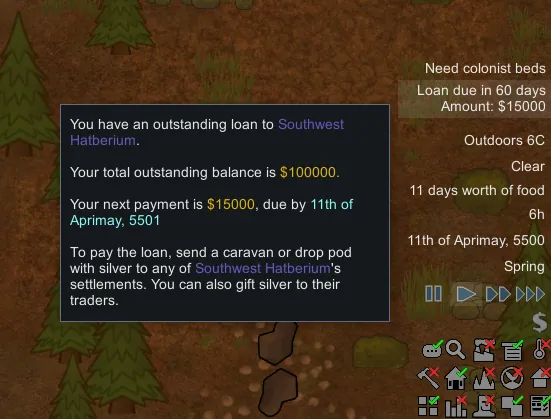 To pay the loan, send drop pods containing silver to any of the lender's settlements. Alternatively, you can use the gift option while trading with any of their traders. You can only use silver to pay back the loan! They don't want your worn-out clothes.