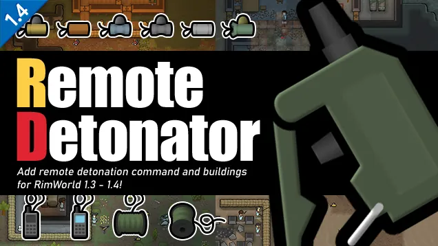 入植者が爆発物を遠隔起爆できるようにします。専用の起爆装置を建設後、追加されたコマンドから起爆が行えるようになります。起爆装置はCompExplosiveをもつものならばだいたい起爆することができます。すべての入植者は起爆スイッチを携帯している設定のため、いつでもどこでも起爆装置を作動させることができます。したがって新しい装備を作ったり、装備したりする必要はありません。専用の起爆装置は研究「IDE」の履修後に建設できるようになります。