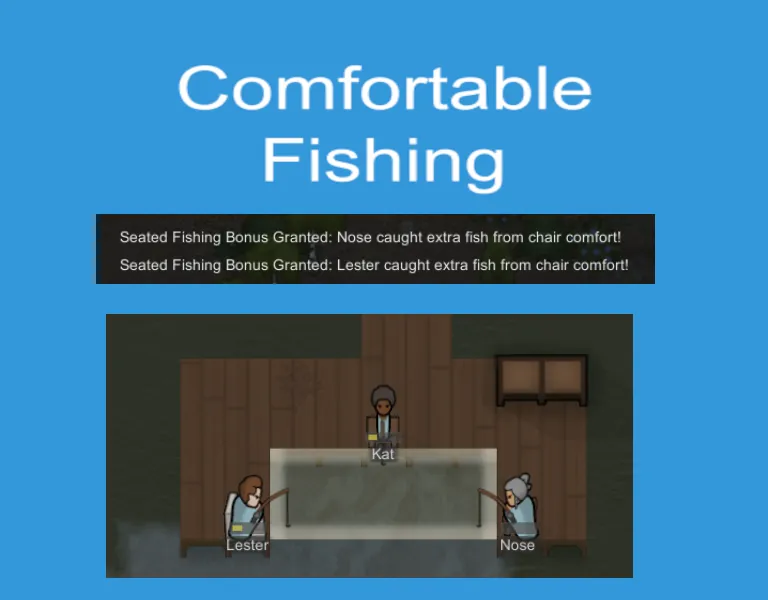 Chairs automatically work when placed near fishing zones (configurable distance). Your pawns will prefer chairs when available, but won't break if none are around.