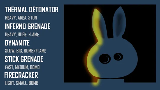 [img]https://i.ibb.co/7bq5F6W/Grenade-Death.png[/img] [img]https://i.ibb.co/RjRcWLV/Grenade-Napalm.png[/img] [img]https://i.ibb.co/S00S849/Grenade-Stasis.png[/img] [img]https://i.ibb.co/CVXfxFK/Grenade-Army.png[/img] [img]https://i.ibb.co/sm5BYzG/Grenade-Crumble.png[/img] [img]https://i.ibb.co/bWwLv3v/Fireball-Cannon.png[/img]