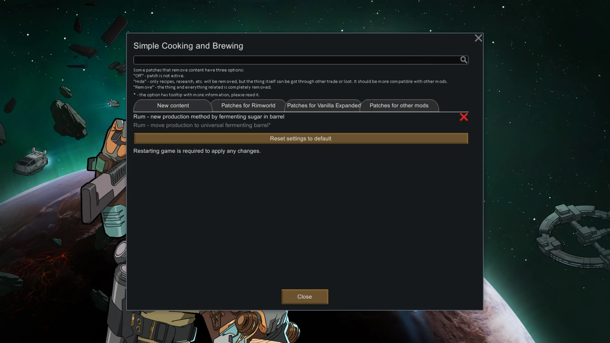 [*] [url=https://steamcommunity.com/sharedfiles/filedetails/?id=3329433117]Mushroom Beer[/url], [url=https://steamcommunity.com/sharedfiles/filedetails/?id=3376864722]Det's Xenotypes - Keshig[/url], [url=https://steamcommunity.com/sharedfiles/filedetails/?id=3018569666]Rim-Gnoblins[/url], [url=https://steamcommunity.com/sharedfiles/filedetails/?id=2559958496]T's Samurai Faction[/url], [url=https://steamcommunity.com/sharedfiles/filedetails/?id=3280268952]Psyshrooms[/url], [url=https://steamcommunity.com/sharedfiles/filedetails/?id=3262128970]Toxicity Evolved[/url], [url=https://steamcommunity.com/sharedfiles/filedetails/?id=3516603515]BoneReapers ReMarrowed[/url], [url=https://steamcommunity.com/sharedfiles/filedetails/?id=3574420212]Sake Brewery (1.3-1.6)[/url], [url=https://steamcommunity.com/sharedfiles/filedetails/?id=3613289193]Smuggler's Run[/url], [url=https://steamcommunity.com/sharedfiles/filedetails/?id=1558161673]Alpha Bees[/url] - move alcohol fermentation to one universal barrel (can ignore any [url=https://steamcommunity.com/sharedfiles/filedetails/?id=3329433117][SYR] Processor Framework (Continued)[/url] requirements