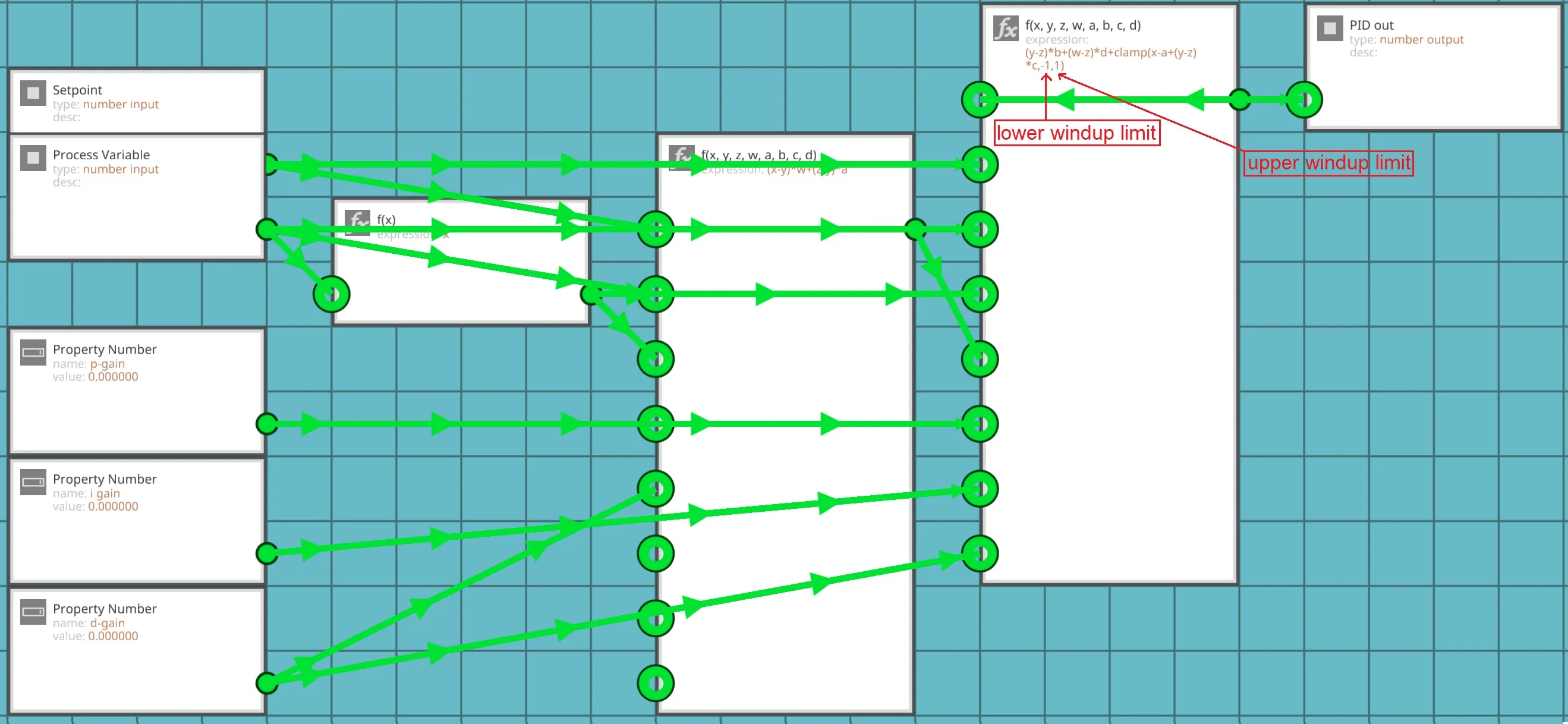 PID with windup protection and minimal latency. You could replace the property blocks with input nodes. Supports dynamic setpoint and dynamic gains.
